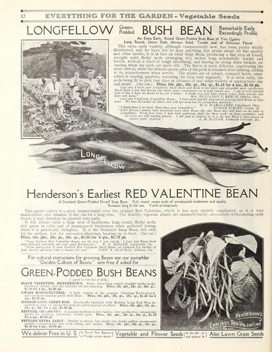 | Keywords: Everything for the garden (15768349674).jpg HI <br> 12 <br> EVE3RYTHEHG FOK THE GAlDEM Vegefelbk Seeds <br> K <br> LONGFELLOW <br> Green' <br> Podded <br> BUSH BEAN <br> Remarkably Early <br> Exceedingly Prolific <br> An Extra Early Round Green-Podded Bush Bean of Fine Qyality <br> Long Round Green Pods Always Solid Tender and of Delicious Flavor <br> This extra early variety although comparatively new has been pietty widely <br> distributed and we have yet to hear anything but praise about its fine quality <br> and other merits; it is in fact an ideal Snap Bean producing a fine crop of round <br> straight solid fleshy pods averaging 6 inches long wonderfully tender and <br> brittle without a trace- of tough interlining and having no string when broken ex- <br> cepting when the pods are quite old The flavor is most delicious captivating the <br> most critical while the delicate green color of the pods is retained after cooking adding <br> to its attractiveness when served The plants are of robust compact habit unex- <br> celled in bearing qualities maturing the crop very regularly It is extra early the <br> pods being fit to pick four days in advance of any other variety of approximate size <br> and merit See cut Price 10c pkt 20c pt 35c qt 1 25 for 4 qts 2 00 pk <br> Last year I tried your Longfellow Bush Bean and think it the finest and altogether most satisfactory <br> Bush Bean I ever had during over thirty years' experience for pi ivate family use I am so well satisfied <br> with it that I have no desire to try for a better I think you will have several orders from persons who <br> have seen mine Mrs BENJAMIN P RENCH Oberlin Ohio <br> Last year I had your Longfellow Beans I have never had the pleasure of growing such Beans as they <br> re We have discarded all others and will use none but the Longfellow hereafter <br> ž ž t ž H E MARGVARDT Cincinnati Ohio <br> 1 think there is no better Bean than your Longfellow JOSEPH SCHOFF Peoria Ill <br> Gen'l Brown' s family have discarded every other Bean; the only Bean they will have on the table is <br> Longfellow From four rows I have been gathering daily for three weeks in large quantities and <br> the vines are still bearing heavily I am glad to endorse it; it is the best Bean I have grown in <br> twenty years' practice A M McTOSH Falmouth Foreside Me <br> Mi j <br> Henderson's Earliest RED VALENTINE BEAN <br> A Standard Green-Podded Dwarf Snap Bean Full round meaty pods of unsurpassed tenderness and quality <br> Remains long fit for use Yields prodigiously <br> This grand variety is a great improvement over the original Red Valentine which it has now entirely supplanted as it is very <br> much earlier and remains fit for use for a long time The healthy vigorous plants are unusually hardy successfully withstanding early <br> frosts; it may therefore be planted very early <br> It will always yield a large crop of handsome long round fleshy pods <br> rich green in color and of unsurpassed tenderness when gathered young <br> when it is practically stringless It is the Standard Snap Bean not only <br> for the earliest but for successive plantings bearing up to frost See cut <br> Price 10c pkt 20c pt 30c qt 1 00 for 4 qts 1 75 pk <br> Your Earliest Red Valentine Beans are the best I ever raised I have had Beans from <br> nine different seedsmen but none equal Henderson's R D MILLER Gainesville Ga <br> From half-a-pinl of your Earliest Red Valentine Bush Beans we gathered 5\4 bushels of <br> pods besides allowing some to mature for seed JOHN B BLACKIE Alioona Pa <br> For cultural instructions for growing Beans see our pamphlet <br> Garden Culture of Beans sent Free if asked for <br> Green-Podded Bush Beans <br> 1 quart to 100-feel of drill <br> BLACK VALENTINE HENDERSON'S Early extra long round straight tender pods; <br> enormous yielder and also suitable for late planting Price 10c pkt 20c pt 30c qt <br> 1 10 for 4 qts 2 00 pk <br> DWARF HORTICULTURAL A bush variety of the popular Climbing Horticultural <br> and the most popular green shell Bean Price 10c pkt 20c pt 35c qt 1 30 for 4 <br> qts 2 50 pk <br> HODSON LONG GREEN POD Practically identical with Hodson Long Pod Wax de- <br> scribed on page 13 except the pods are green instead of yellow Price 10c pkt 15c pt <br> 25c qt 85c for 4 qts 1 50 pk <br> REFUGEE OR 1 000 TO 1 A popular medium to late variety very productive; extensively <br> grown for pickling; handsome tender pods Price 10c pkt 20c pt 30c qt 1 10 <br> for 4 qts 2 00 pk <br> REFUGEE EXTRA EARLY Similar to above but nearly two weeks earlier; enormously <br> prolific exceptionally free from string and tender Price 10c pkt 20c pt 30c qt <br> 1 10 for 4 qts 2 00 pk <br> We deliver Free in U S \ m PosI E w Vegetable and Flower Seeds ¢ by J hepk - f- Also Lawn Grass Seeds <br> - ' or rreight at our option Q _ I and quarter lb ' -_ ____ - ; __ __ __-_ ___ _ 43874804 149634 78295 Page 12 Text http //www biodiversitylibrary org/page/43874804 c1915 10 5962/bhl title 78295 Henry G Gilbert Nursery and Seed Trade Catalog Collection ; Peter Henderson Co NameFound Alioona NameFound Peoria NameConfirmed Peoria EOLID 47609 NameBankID 2627534 Biodiversity Heritage Library Everything for the garden 1915 Garden Stories Books Bulbs Plants Catalogs Equipment and supplies Flowers Gardening Lawn mowers Seeds U S Department of Agriculture National Agricultural Library bhl page 43874804 dc identifier http //biodiversitylibrary org/page/43874804 bhlGardenStories BHLinbloom bulbs plants u s department of agriculture national agricultural library bhlgardenstories bhlinbloom Information field Flickr posted date ISOdate 2015-01-28 Check categories 2015 August 25 CC-BY-2 0 BioDivLibrary https //flickr com/photos/61021753 N02/15768349674 2015-08-25 03 01 25 cc-by-2 0 PD-old-70-1923 Everything for the garden 1915 Photos uploaded from Flickr by Fæ using a script |