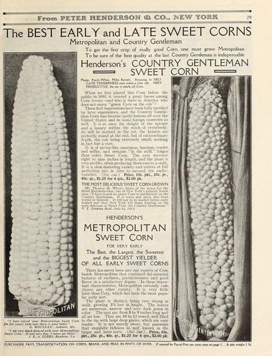 | Keywords: Everything for the garden (15768379584).jpg From PETER 1EMDE1S0M <br> COo KEW YOIRH <br> 29 <br> The BEST EARLY and LATE SWEET CORNS <br> k Ji j B <br> a /l <br> A - ¢'-« <br> i JK <br> jh <br> Ekt <br> RL linopgSMM <br> 7 feai/e raised your Metropolitan Sweet Com <br> for five years; lam sure there is none better <br> G ROULEAU Auburn Me <br> I ant very much pleased with your Metropolitan <br> Sugar Corn It was very fine; I never ale better <br> J E A GIBBS Raphine Va <br> Metropolitan and Country Gentleman <br> To get the first crop of really good Corn one must grow Metropolitan <br> To be sure of the best quality at the last Country Gentleman is indispensable <br> Henderson's COUNTRY GENTLEMAN <br> ” SWEET CORN <br> Plump Pearly-White Milky Kernels Retaining its DELI- <br> CATE TENDERNESS even when a little old VERY <br> PRODUCTIVE the ear is nearly all Corn <br> When we first placed this Corn before the <br> public in 1891 it created a great furore among <br> Corn lovers ” and who is there in America who <br> does not enjoy green Corn on the cob <br> These first impressions have been fully justified <br> by later experiences and the Country Gentle- <br> man Corn has become justly famous all over the <br> United States and in some foreign countries as <br> well It is at once the delight of -the epicure <br> and a luxury within the reach of everybody <br> As will be noticed in the cut the kernels are <br> perfectly round at the end but of extraordinary <br> depth the cob being extremely small; nothing <br> in fact but a core <br> It is of nectar-like sweetness luscious tender <br> and milky and remains in the milk longer <br> than other Sweet Corn The ears measure <br> eight to nine inches in length and the plant is <br> very prolific often producing three ears to a stalk <br> It is a slow-maturing variety and arrives at full <br> perfection just in time to succeed the earlier <br> varieties See cut Price 10c pkt 25c pt <br> 40c qt 1 25 for 4 qts 2 00 pk <br> THE MOST DELICIOUS SWEET CORN GROWN <br> Mr Thomas M Whyte buyer of the stores for the <br> Hotel Knickerbocker one of New York's palatial hotels <br> says I have found no green Corn so satisfactory as the <br> Country Gentleman It is sweet and juicy free from <br> worms or blemish It will not be in market before early <br> August and then New York will begin feasting on the <br> most delicious of Sweet Corn the Country Gentleman <br> N Y Evening Mail July 24 1913 <br> HENDERSON'S <br> METROPOLITAN <br> Sweet Corn <br> FOR VEKY EARLY <br> The Best the Largest the Sweetest <br> and the BIGGEST YIELDER <br> OF ALL EARLY SWEET CORNS <br> There has never been any one variety of Corn <br> beside Metropolitan that combined the essential <br> features of earliness productiveness and good <br> flavor in a satisfactory degree In these impor- <br> tant characteristics Metropolitan certainly out- <br> classes any other variety It is very little <br> later than Cory which has been the most popu- <br> lar early sort <br> The plant is distinct being very strong in <br> stalk growing 5 feet in height The leaves <br> are numerous narrow and very dark green in <br> color The ears are from 8 to 9 inches long and <br> all set low They are 10 to 12 rowed well filled <br> to the tip with large deep grains which are very <br> tender It is not merely sweet but possesses <br> that exquisite richness so well known in the <br> larger and later sorts See cut Price 10c <br> pkt 25c pt 40c qt 1 25 for 4 qts 2 00 pk <br> PURCHASER PAYS TRANSPORTATION ON CORN BEANS AND PEAS IN PINTS OR OVER If wanted by Parcel Post see zone rates on page I A pint weighs 1 lb 43874821 149634 78295 Page 29 Text http //www biodiversitylibrary org/page/43874821 c1915 10 5962/bhl title 78295 Henry G Gilbert Nursery and Seed Trade Catalog Collection ; Peter Henderson Co Biodiversity Heritage Library Everything for the garden 1915 Garden Stories Books Bulbs Plants Catalogs Equipment and supplies Flowers Gardening Lawn mowers Seeds U S Department of Agriculture National Agricultural Library bhl page 43874821 dc identifier http //biodiversitylibrary org/page/43874821 bhlGardenStories BHLinbloom bulbs plants u s department of agriculture national agricultural library bhlgardenstories bhlinbloom Information field Flickr posted date ISOdate 2015-01-28 Check categories 2015 August 25 CC-BY-2 0 BioDivLibrary https //flickr com/photos/61021753 N02/15768379584 2015-08-25 03 00 23 cc-by-2 0 PD-old-70-1923 Everything for the garden 1915 Photos uploaded from Flickr by Fæ using a script |