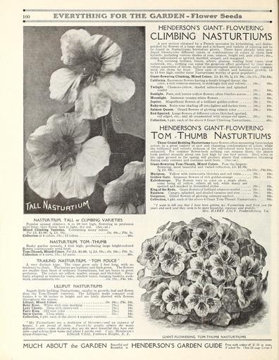 | Keywords: Everything for the garden (15768504474).jpg 100 <br> ;VERÂ¥TInII MG FOR TIE GAIRDEM - Flower Seeds <br> NASTURTIUM TALL or CLIMBING VARIETIES <br> Popular annual climbers 6 to 10 feet high flowering in profusion <br> until frost; they flower best in light dry soil See cut <br> Mixed Climbing Varieties Containing many colors <br> Per Lb 1 00; Lb 35c Oz 10c; Pkt 5c <br> Collection of 6 colors 25c; 12 colors 40c <br> NASTURTIUM TOM -THUMB <br> Bushy garden annuals 1 foot high producing large bright-colored <br> flowers continuously until frost <br> Tom-Thumb Mixed Colors Per Lb 1 00; HLb 35c; Oz 10c; Pkt 5c <br> Collection of 6 sorts 25c; 12 sorts 40c <br> TRAILING NASTURTIUM TOM POUCE <br> A very distinct type The vines grow only 2 feet long with no <br> tendency to climb Theleaves areleathery and dark green The flowers <br> are smaller than those of ordinary Nasturtiums but are borne in great <br> profusion The colors are yellow scarlet orange and blotched Pecu- <br> liarly adapted as trailers for vases window boxes hanging baskets rock- <br> work embankments etc Oz 25c; Pkt 10c <br> LILLIPUT NASTURTIUMS <br> Superb little bedding Nasturtiums smaller in growth leaf and flower <br> than the Tom-Thumb varieties The Lilliputs make compact oval <br> bushes 8 to 10 inches in height and are fairly sheeted with flowers <br> throughout the season <br> Lilliput Mixed Colors Oz 20c; Pkl 10c <br> Baby Rose White with rose marking 25c; 10c <br> Lady Cherry Deep rich cherry-red 25c; 10c <br> Fairy King Old rose color 25c; 10c <br> Snow Queen Clear white 25c ; 10c <br> Collection 1 pkt each of the above 4 separate varieties 30c <br> My Nasturtiums are a profusion of blossoms ” and an expanse of <br> beauty I am proud of them Passers-by greatly admire the many <br> different colors ” some declaring they are the most beautiful they have ever <br> seen ” and asking their name and where I got the seed I say 'Henderson's <br> Giant-Flowering ' EDGAR VAIL Yorktown Heights N Y <br> HENDERSON'S GIANT- FLOWERING <br> CLIMBING NASTURTIUMS <br> A new section obtained by a French specialist by hybridizing and distin- <br> guished by flowers of a large size and a richness and variety of coloring not to <br> be found in Nasturtiums heretofore grown There have already been pro- <br> duced twenty-two different colors or combinations of colors in these new <br> hybrids including various shades of rose salmon bright red pale yellow etc <br> either self-colored or spotted mottled striped and margined <br> For covering trellises fences arbors piazzas trailing from vases over <br> rockwork etc nothing can equal the gorgeous effect produced by their mar- <br> velous quantities of bloom borne in uninterrupted splendor from early summer <br> until cut down by frost Their ease of culture and luxuriant growth 12 <br> to 15 feet high render these Nasturtiums worthy of great popularity <br> Giant-flowering Climbing Mixed Colors Lb 1 50; \i Lb 50c; Oz lSc; Pkt lOc <br> California Enormous flowers having a deeply fringed throat; the <br> color a rich crimson-maroon is strikingly rich and velvety 20c; 10c <br> Twilight Chamois-yellow shaded salmon-rose and splashed <br> scarlet 20c ; 10c <br> Sunlight Pure rich butter-yellow flowers often 3 inches across 20c; 10c <br> Moonlight Immense creamy- white flowers 20c; 10c/ <br> Jupiter Magnificent flowers of a brilliant golden-yellow 20c ; 10c <br> Ruby-rose Ruby-rose shading off into lighter and darker tints 20c; 10c <br> Salmon Queen Grand flowers of glowing salmon color 20c; 10c <br> Red Spurred Large flowers of different colors blotched spotted <br> red edged etc and all ornamented with unique red spurs 20c; '10c <br> Collection 1 pkt each of the above 8 Giant Climbing Nasturtiums 60c <br> HENDERSON'S GIANTFLOWERING <br> Tom Thumb Nasturtiums <br> These Grand Bedding Nasturtiums have flowers often measuring three inches <br> across in a great variety of new and charming combinations of colors while <br> the brilliancy and velvety richness of the self-colored sorts have been greatly <br> enhanced For summer flower-beds nothing can surpass them; the plants <br> form perfect mounds about one foot high by one foot across Seed sown in <br> the open ground in the spring will produce plants that commence blooming <br> during early summer and continue until frost See cut <br> Giant-flowering Tom-Thumb Mixed Colors Fom the largest- <br> flowering most beautiful and varied collection Lb 1 50; <br> M Lb 50c Oz l5c; PktAOc <br> Mariposa Yellow with terra-cotta blotches and red veins 20c; 10c <br> Golden Gate Immense flowers of rich golden-orange 20c; 10c <br> Kaleidoscope The flowers vary in color on a single plant <br> some being all yellow others all red while many are <br> spotted and marked in diversified styles 20c; 10c <br> King of the Reds Giant flowers of brilliant crimson-scarlet 20c; 10c <br> Rainbow Canary splashed and shaded carmine and rose 20c; 10c <br> Gorgeous Grand flowers of glowing salmony-apricot 20c; 10c <br> Collection 1 pkt each of the above 6 Giant Tom-Thumb Nasturtiums 50c <br> I want to tell you that I have been getting my Nasturtium seed from you for <br> years and each year they seem to be more beautiful vigorous and prolific <br> Mrs HARRY LACY Fredericksburg Va <br> GIANT-FLOWERING TOM-THUMB NASTURTIUMS <br> MUCH ABOUT the GARDEN <br> Beautiful and <br> Bountiful in <br> HENDERSON'S GARDEN GUIDE <br> Free with orders of 1 00 or over <br> if asked for- See 2d page Cover 43874892 149634 78295 Page 100 Text http //www biodiversitylibrary org/page/43874892 c1915 10 5962/bhl title 78295 Henry G Gilbert Nursery and Seed Trade Catalog Collection ; Peter Henderson Co NameFound Mariposa NameConfirmed Mariposa NameBankID 4232456 Biodiversity Heritage Library Everything for the garden 1915 Garden Stories Books Bulbs Plants Catalogs Equipment and supplies Flowers Gardening Lawn mowers Seeds U S Department of Agriculture National Agricultural Library bhl page 