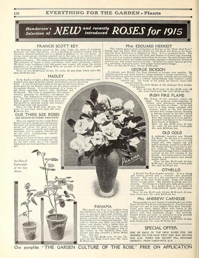 Keywords: Everything for the garden (15768552214).jpg 128 <br> fG FOR THE GARDEH - Plants <br> Henderson's <br> Selection of <br> I NEW <br> and recently <br> introduced <br> ROSES for 1915 <br> FKANCIS SCOTT KEY <br> An American seedling raised by Mr John Cook the raiser of Cardinal <br> Radiance and other fine Roses It is a seedling of Cardinal crossed with an <br> unnamed crimson -seedling and is a grand acquisition to our red Roses A <br> strong sturdy grower whether planted out in the open or on benches in the <br> greenhouse The flowers are a deep red of largest size with finely formed petals <br> of great substance The stems are strong and straight holding the flowers erect <br> The profusion of bloom is truly marvellous every shoot producing a flower <br> We have every confidence that this grand new variety will attain the widest <br> popularity as an outdoor bedding Rose on account of its free habit superb <br> color and fine double flowers <br> Price 1st size 1 00 each; 2d size 75c each; 3d size from 3-inch pots 50c <br> each 5 00 per doz <br> HADLEY <br> In the Hadley we have a Rose that possesses a rich and lasting crims on color <br> coupled with vigor of growth robust constitution and free blooming <br> habit It will be welcomed alike by the grower who forces Roses <br> under glass for cut flowers and the one who plants outdoors <br> for summer flowers It is a development of a strain of <br> red Roses including Liberty Gen McArthur and <br> Richmond The color is magnificent rich velvety- <br> crimson retaining its brilliancy throughout the <br> season The fragrance is delightful and refresh- <br> ing The flowers are borne on long stems and <br> keep in good condition a long time when cut <br> The growth is splendid sturdy and healthy <br> the foliage large and abundant <br> Price 1st size 1 00 each; 2d size 75c <br> each; 3d size from 3-inch pots 50c each <br> 5 00 per doz <br> OUR THIRD SIZE ROSES <br> ARE GROWN IN THREE -INCH POTS <br> They are superior to the young Roses <br> from 2-inch pots usually sent out because <br> the larger pot gives ample room for root <br> action and allows the plant to grow <br> naturally They are sturdy and compact <br> and when sent by express with the soil <br> on the roots transplanting scarcely <br> checks their growth <br> In the cut below we show a fair sample <br> of a 2-inch pot plant as usually sent out <br> by the mail trade and a fair sample <br> taken from our stock growing in a 3-inch <br> pot <br> See Note of <br> Explanation <br> of this Cut <br> Above <br> Mme edouard herriot <br> _ This variety gained great prominence in Europe as the Daily Mail Rose <br> having won the Daily Mail cup offered for the finest new Rose at the Inter- <br> national Rose Exhibition in England in 1912 It is a wonderful Rose The <br> combination of color shown in the buds and flowers is distinct and charming <br> In the bud it is coral-red shaded with yellow at the base the open flowers coral- <br> red shaded with yellow and bright rosy-scarlet passing to shrimp-red; flowers of <br> medium size well formed and not too full The plant is a most vigorous grower <br> of a spreading branching habit with ample bronzy-green foliage <br> Price 1st size 1 50 each; 2d size 1 00 each <br> GEORGE DICKSON <br> _ A majestic new Hybrid Tea Rose destined to become very popular Its <br> vigorous growth and thick leathery foliage bespeak a strong constitution It <br> produces flowers quite five inches across that for color contour and rare perfume <br> are unrivalled The color is a velvety black-crimson with brilliant scarlet <br> reflexed tips The backs of the petals are heavily veined with <br> crimson-maroon <br> Awarded the Gold Medal of the National Rose Society <br> of England <br> Price 1st size 1 25 each; 2d size 1 00 each; 3d <br> size from 3-inch pots 50c each 5 00 per doz <br> IRISH FIRE FLAME <br> The flowers of this exquisite variety are <br> single The gorgeous super-imposing of <br> intense color gradations spontaneously <br> conveys the idea of a flame In the bud <br> state it is deep orange splashed with <br> crimson which as the bud develops <br> becomes fiery orange-crimson changing <br> to delicate orange in the fully opened <br> flower Deliriously fragrant A grand <br> Rose that should be in every garden <br> Awarded Gold Medal of the National <br> Rose Society of England <br> Price 1st size 1 00 each; 2d size <br> 75c each; 3d size from 3-inch pots <br> 35c each 3 50 per doz <br> OLD GOLD <br> A strikingly beautiful new Hybrid <br> Tea Rose In the bud it is particu- <br> larly attractive The color is a vivid <br> orange - red with coppery - red and <br> apricot shadings A gem for cut flowers <br> the blooms lasting a long time in per- <br> fect condition _ The healthy glossy <br> bronze-green foliage forms a delightful <br> contrast to the rich coloring of the <br> flowers It is sweet scented very free <br> flowering a good grower and almost <br> mildew proof <br> Price 1st size 1 25 each; 2d size <br> 1 00 each; 3d size from 3-inch pots <br> 35c each 3 50 per doz <br> OTHELLO <br> PANAMA <br> This grand new Rose is a seedling from <br> the well known Frau Karl Druschki crossed <br> with an unnamed light pink seedling and <br> was raised by Mr John Cook It is a healthy <br> grower carrying the flowers on long stems <br> remarkably free blooming and fragrant The <br> color is delicate rosy flesh very soft in the <br> center and shaded with a lighter flesh at <br> the ends of the petals The judges for the <br> American Rose Society thought so well of <br> this variety at the Hartford Rose Test <br> Garden that they awarded a Silver Medal <br> for it See cut <br> Price 1st size 1 00 each; 2d size 75c <br> each; 3d size from 3-inch pots 50c each <br> 5 00 per doz <br> A Hybrid Tea Rose of great promise It is a strong <br> and healthy grower and a constant and abundant <br> bloomer The color is a rich maroon-red with darker <br> shadings at the base 