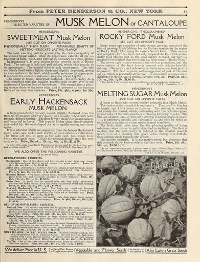 Keywords: Everything for the garden (16203222698).jpg From PETEM HEMDERSOM <br> CO O0 MEW YORK <br> 41 <br> HENDERSON'S <br> SELECTED VARIETIES OF <br> MUSK MELON or cantaloupe <br> HENDERSON'S <br> SWEETMEAT Musk Melon <br> SEE CUT ON OPPOSITE PAGE <br> PHENOMENALLY THICK FLESH REMARKABLE BEAUTY OF <br> NETTING ” DELICATE LASTING FLAVOR <br> The most exacting will be gratified by the delicious quality of <br> Sweetmeat Musk Melon while its appearance exhibits all the re- <br> finement of form color and netting so necessary to a good Melon <br> In appearance it is very similar to the rounder types of Rocky <br> Ford The netting is bold and well defined which adds greatly to <br> its appearance The general color is soft russet-green The ribs <br> are faintly lined with a lighter shade and slightly depressed giving <br> an even surface to the fruit which greatly enhances its appearance <br> It is about five inches in diameter weighing about 2J4 lbs <br> The shape is round somewhat flattened Its remarkably deep <br> flesh combined with the smallest possible seed cavity give it the <br> maximum of luscious flesh of fine texture This merges into a pleas- <br> ing salmon shade at the inner edge and it possesses all the luscious <br> flavor of the very best varieties Price 15c pkt 4 pkts for 50c <br> HENDERSON'S <br> Eakly Hackensack <br> MUSK MELON <br> A large green-fleshed variety round slightly flattened from the <br> Stem to the blossom end very deeply and broadly ribbed with bold <br> strongly defined netting The flesh is very thick rich in appearance <br> and beautiful in flavor This type of Melon once almost entirely <br> superseded by the oval- shaped sorts is rapidly coming into favor <br> again <br> It is a selection which we originated from the famous Hackensack <br> many years ago and is well worthy of more extensive cultivation <br> The fruits are not so large as the older sort but weigh from <br> five to six pounds each It is fit for use immediately after the very <br> early sorts Price 10c pkt 15c oz 40c 34 lb 1 25 lb <br> / have been using your Early Hackensack Melon seed for the past four years <br> with excellent results JOHN H CALDWELL Newburgh N Y <br> WE ALSO OFFER THE FOLLOWING VARIETIES <br> 1 oz for 60 hills <br> GREEN-FLESHED VARIETIES <br> Hackensack One of the oldest and best; attains a very large size; round <br> with flattened ends; thickly netted; productive; extra quality Price 5c <br> pkt 10c oz 30c K lb 1 00 lb <br> Jenny Lind Henderson's Superior Selection Small round-flat fruit deeply <br> ribbed; flesh yellowish-green and of unsurpassed flavor; very productive <br> Price 5c pkt 15c oz 35c M lb 1 10 lb <br> Montreal Market Very large almost round heavily netted; thick luscious <br> green flesh; late and especially adapted to cooler climates Price 10c <br> pkt 15c oz 45c M lb 1 50 lb <br> Netted Gem A grand sort for general early use; very early productive <br> uniform and finely netted; flesh rich green deiiciously sweet and melting <br> Price 5c pkt 10c oz 30c i lb 1 00 lb <br> Newport Henderson's Very early The fruits are round and flattened <br> at ends; exterior dull green ripening to a rich golden color Flesh of ex- <br> quisite texture; a bountiful yielder; the fruits are of desirable size Price <br> 10c pkt 15c oz 40c M lb 1 25 lb <br> Nutmeg Improved A popular old variety; skin deep green finely netted; <br> flesh greenish- yellow rich and sugary Price 5c pkt 10c oz 30c 4 lb <br> 1 00 lb <br> RED OR SALMON-FLESHED VARIETIES <br> Emerald Gem No variety surpasses this in quality; the thick salmon-col- <br> ored flesh is granular rich and delicious in flavor It is exceedingly early <br> prolific and long bearing; fruits small smooth-skinned deep emerald-green <br> with light stripes Price 10c pkt 15c oz 40c M lb 1 25 lb <br> Miller's Cream or Osage Medium to large slightly oval and handsomely <br> netted; flesh rich salmon deep firm sweet and melting Price 5c nkt <br> 15c oz 40c M lb 1 25 lb <br> Paul Rose This splendid variety is a cross between Netted Gem and Miller's <br> Cream combining the best qualities of both It ripens an immense num- <br> ber of moderate-sized fruits; flesh salmon deep sweet and richly flavored <br> Price 5c pkt 15c oz 40c M lb 1 25 lb <br> BURRELL GEM OR RED ROCKY FORD The flesh is orange-salmon very <br> thick fine-grained and of delicious flavor The skin is a rich dark green <br> covered with a fine grayish netting It ripens close to the skin leaving <br> only a thin rind See cut Price 10c pkt 15c oz 40c M lb 1 25 lb <br> Tip Top One of the best salmon-fleshed sorts; bears an enormous crop of <br> delicious quality Price 10c pkt 15c oz 45c H lb 1 50 lb <br> HENDERSON'S THOROUGHBRED <br> ROCKY FORD Musk Melon <br> SEE CUT ON OPPOSITE PAGE <br> Some years ago a number of enterprising growers conceived the <br> idea of growing Musk Melons for the Eastern markets in the region <br> of Rocky Ford Colo using the variety Netted Gem Their success <br> was complete for they have not only supplied the East with partic- <br> ularly good Melons just as the local supply declined but have so <br> improved the original that the strain has been named Rocky Ford <br> The newer type is more rounded the rib less prominent and the <br> outer surface of the fruit densely covered with delicate lace-like <br> netting The quality and rich aromatic flavor have also been greatly <br> improved The flesh is green with a suggestion of pink at the seed <br> cavity which is peculiarly attractive It is beautiful in appearance <br> delightful in flavor and a general favorite with all Price 5c pkt <br> 10c oz 30c \i lb 1 00 lb <br> The Rocky Ford Melons ¢were most delicious and remarkably productive <br> E H PLATT Walervliel N Y <br> HENDERSON'S <br> MELTING SUGAR Musk Melon <br> SEE CUT ON OPPOSITE PAGE <br> A boon to those who esteem quality primarily in a Musk Melon <br> The fruits exhibit remarkable uniformity They are 7 to 8 inches <br> in length and 