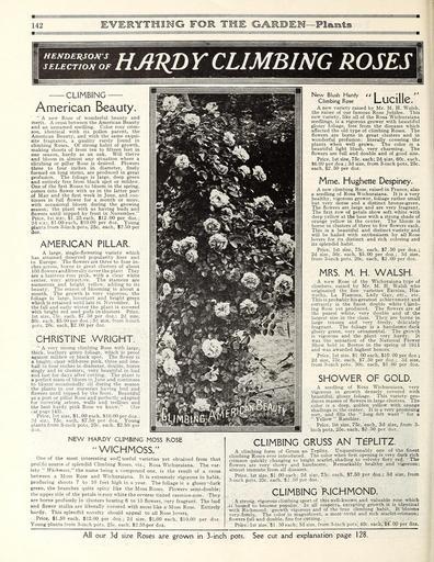 | Keywords: Everything for the garden (16203400278).jpg 142 <br> EVERYTHING FOR THE GARD EM Plants <br> HENDERSON'S <br> SELECTION OF <br> HJtUDY CLIMBING ROSES <br> CLIMBING <br> American Beauty <br> A new Rose of wonderful beauty and <br> merit A cross between the American Beauty <br> and an unnamed seedling Color rosy crim- <br> son identical with its pollen parent the <br> American Beauty and with the same exqui- <br> site fragrance a quality rarely found in <br> climbing Roses Of strong habit of growth <br> making shoots of from ten to fifteen feet in <br> one season hardy as an oak Will thrive <br> and bloom in almost any situation where a <br> climbing or pillar Rose is desired Flowers <br> three to four inches in diameter finely <br> formed on long stems are produced in great <br> profusion The foliage is large deep green <br> and entirely free from black spot or mildew <br> One of the first Roses to bloom in the spring <br> comes into flower with us in the latter part <br> of May and the first week in June and con- <br> tinues in full flower for a month or more <br> with occasional bloom during the growing <br> season; the plant with us having buds and <br> flowers until nipped by frost in November <br> Price 1st size SI 25 each 12 00 per doz ; <br> 2d s z2 SI 00 each 10 00 per doz Young <br> plants from 3-inch pots 25c each 2 50 per <br> doz <br> AMEKICAN PILLAR <br> A large single-flowering variety which <br> has attained deserved popularity here and <br> in Europe The flowers are three to four in- <br> ches across borne in great clusters of about <br> 100 flowers andliterally cover the plant They <br> are a lustrous rosy pink with a clear white <br> center very attractive The stamens are <br> numerous and bright yellow adding to its <br> beauty The season of blooming is about a <br> month The growth is very vigorous the <br> foliage is large luxuriant and bright green <br> which is retained until late in November In <br> the fall and early winter the plant is covered <br> with bright red seed pods in clusters Price <br> 1st size 75c each S7 50 per doz ; 2d size <br> 50c each S5 00per doz ; 3d size from 3-inch <br> pots 20c each 2 00 per doz <br> CHRISTINE WRIGHT <br> A very strong climbing Rose with large <br> thick leathery green foliage which is proof <br> against mildew or black spot The flower is <br> a bright clear wild-rose pink three and one- <br> half to four inches in diameter double borne <br> singly and in clusters; -very beautiful in bud <br> and last for days after cutting The plant is <br> a perfect mass of bloom in June and continues <br> to bloom' occasionally all during the season <br> the plants in our nurseries having bud and <br> flowers until nipped by the frost Beautiful <br> as a post or pillar Rose and perfectly adapted <br> for covering arbors walls and trellises and <br> the best hardy pink Rose we know See <br> cut page 143 <br> Price 1st size 1 00 each SlO OOper doz ; <br> 2d siz; 75c each S7 50 per doz Young <br> plants from 3-inch pots 25c each 2 50 per <br> doz <br> NEW HAKDY CLIMBING MOSS KOSE <br> WICHMOSS <br> One of the most interesting and useful varieties yet obtained from that <br> prolific source of splendid Climbing Roses viz ; Rosa Wichuraiana The var- <br> iety Wichmoss the name being a compound one is the result of a cross <br> between a Moss Rose and Wichuraiana It is extremely vigorous in habit <br> producing shoots 7 to 10 feet high in a year The foliage is a glossy-dark <br> green the branches quite spiny like the Moss Roses Flowers semi-double; <br> the upper side of the petals is rosy white the reverse tinted carmine-rose They <br> are borne profusely in clusters bearing 6 to 15 flowers very fragrant The bud <br> and flower stalks are liberally covered with moss like a' Moss Rose Entirely <br> hardy This splendid noyelty should appeal to all Rose lovers <br> Price 1 50 each 12 00 per doz ; 2d size 1 00 each S10 00 per doz <br> Young plants from 3-inch pots 25c each 2 50 per doz <br> New Blush Hardy 4\ '11 ' <br> Climbing Rose LUClllC <br> A new variety raised by Mr M H Walsh <br> the raiser of our famous Rose Jubilee This <br> new variety like all of the Rosa Wichuraiana <br> seedlings is a vigorous grower with beautiful <br> glossy foliage free from the diseases which <br> affected the old type of climbing Roses The <br> flowers are borne in great clusters and in <br> wonderful profusion; literally covering the <br> plants when well grown The color is a <br> beautiful light blush very charming The <br> flowers are full and double and of good size <br> Price 1st size 75c each; 2d size 60c each <br> 6 00 per doz ; 3d size from 3-inch pots 25c <br> each 2 50 per doz <br> Mme Hughette Despiney <br> A new climbing Rose raised in France also <br> a seedling of Rosa Wichuraiana It is a very <br> healthy vigorous grower foliage rather small <br> but very dense and a distinct bronze-green <br> The flowers are large and are very fragrant <br> The first row of petals show soft white with <br> deep yellow at the base with a strong shade of <br> orange yellow in the center The bloom is <br> borne in clusters of three to five flowers each <br> This is a beautiful and distinct variety and <br> will be hailed with enthusiasm by all Rose <br> lovers for its distinct and rich coloring and <br> its splendid habit <br> Price 1st size 75c each 7 50 per doz ; <br> 2d size 50c each So 00 per doz ; 3d size <br> from 3-inch pots 20c each 2 00 per doz <br> MRS M H WALSH <br> A new Rose of the Wichuraiana type of <br> climbers raised by Mr M H Walsh who <br> originated the fine varieties Excelsa Hia- <br> watha La Fiamma Lady Gay etc etc <br> This is probably his greatest achievement and <br> certainly is the finest double white Climb- <br> ing Rose yet produced The flowers are of <br> the purest white very double and of the <br> largest size in the class They are borne in <br> large trusses and very freely delicately <br> fragrant The foliage is a hand