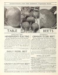 Keywords: Everything for the garden (16203411810).jpg EXTRA EARLY BEET <br> HENDERSON'S ELECTRIC <br> An Ideal Table Beet Fine Grained Rich Red Flesh <br> Electric Beet is the best extra early variety grown quite as early <br> as any perfect in form and of medium size The leaves are quite <br> small and grow so compactly that they may be removed without <br> marring the symmetry of the roots so that they present an extremely <br> attractive appearance on the table The quality is excellent ten- <br> der sweet and quite free from tough fibre The color is most <br> attractive and its quick growing habit makes it particularly desir- <br> able for the private garden See cut Price 10c pkt 20c oz <br> 60c M lb 2 25 lb <br> We wish to say that your Electric Blood Turnip Beets are the very best for our <br> market that we ever planted W W SAMUEL SONS <br> R D No 1 Ettrick Va <br> EARLY MODEL BEET <br> This splendid variety is of English origin and is perfect for table <br> use It is medium early coming in between Extra Early Elec- <br> tric and Crimson Globe The roots are of good size slightly oval <br> with small dark crimson leaves and a slim tap root In <br> quality and color it is peerless; very fine grained tender and <br> sweet never woody or stringy Color of both skin and flesh <br> deep rich crimson equalling that of the best long Beets See cut <br> Price 10c pkt 20c oz 60c lb 2 25 lb <br> / may sof that my Early Model Beets from your seed are praised by all who see <br> them; tender sweet and of grand color <br> GEO L FARMER Tuxedo Park N Y <br> CROSBY'S EGYPTIAN BEET <br> The largest of the very early sorts It is very quick to attain size <br> The shape is a little fiat but very uniform The tops are small <br> and the whole plant grows easily and quickly The flesh is some- <br> what lighter in color than usual but is very attractive It is an <br> excellent variety for early use Price 10c pkt 20c oz 55c 34 lb <br> 2 00 lb <br> HENDERSON'S <br> CRIMSON GLOBE BEET <br> A Grand Second Early and Main Crop Variety <br> Crimson Globe Beet This variety has become remarkably <br> popular among gardeners in all sections of the country and needs <br> no recommendation to those who have grown it It is of medium <br> size generally about 3 inches in diameter very handsome in shape <br> a little deeper than round with a smooth even surface The leaves <br> are rich crimson in color borne on slender stems which grow quite <br> compactly and are thus easily removed The flesh is deep crimson <br> ringed and zoned in varying shades It is exquisitely tender and <br> delicious in flavor Though it grows quickly enough for very early <br> use it will remain tender for a very long period See cut Price <br> 10c pkt 20c oz 60c \i lb 2 25 lb <br> We got First Prize on Crimson Globe Beets at our fair They were very fine <br> Miss MABEL HANLY Imlay City Mich <br> Henderson's Crimson Globe Beet has gained and maintained a reputation as a <br> main crop variety of the finest quality and handsome appearance It is a splendid <br> keeper and in fact has become so popular that some envious seedsmen prefix their <br> names to it We had some for dinner on April 30th and they were still tender and <br> delicious WM E VAIL Yorktown Heights N Y <br> GENERAL LIST OF BEETS <br> / oz to SO feet of drill <br> DEWING'S A very handsome medium late variety smooth and round tapering <br> at the base; color blood red strongly zoned of fine quality Price 5c pkt <br> 20c oz 55c M lb 2 00 lb <br> EARLY BLOOD TURNIP A standard variety following Eclipse in season; <br> qualitv excellent; color deep blood red; the tops make excellent greens <br> Price '5c pkt 20c oz 55c i lb 2 00 lb <br> EARLY YELLOW TURNIP Orange-yellow flesh of sweet flavor; pale green <br> leaves Price 5c pkt 20c oz 55c M lb 2 00 lb <br> EDMAND'S One of the best varieties; medium in size and intensely dark in <br> color Fine for fall crop and the best for family canning Price 5c pkt <br> 20c oz 55c K lb 2 00 lb <br> EGYPTIAN A standard extra early sort maturing very quickly The roots <br> are round and flattened of good size and deep crimson in color; should be <br> used when quite young Price 5c pkt 20c oz 55c l A lb 2 00 lb <br> LONG SMOOTH BLOOD-RED An excellent late variety being a great <br> improvement on the common Long Blood and of intense dark red color <br> Price 5c pkt 20c oz 55c i lb 2 00 lb <br> For SUGAR BEET and MANGEL WUKZEL see Farm Seed Department page 73 <br> For instructions for growing Beets see our pamphlet Garden Culture of Root Crops sent free if asked for 43874810 149634 78295 Page 18 Text http //www biodiversitylibrary org/page/43874810 c1915 10 5962/bhl title 78295 Henry G Gilbert Nursery and Seed Trade Catalog Collection ; Peter Henderson Co Biodiversity Heritage Library Everything for the garden 1915 Garden Stories Books Bulbs Plants Catalogs Equipment and supplies Flowers Gardening Lawn mowers Seeds U S Department of Agriculture National Agricultural Library bhl page 43874810 dc identifier http //biodiversitylibrary org/page/43874810 bhlGardenStories BHLinbloom bulbs plants u s department of agriculture national agricultural library bhlgardenstories bhlinbloom Information field Flickr posted date ISOdate 2015-01-28 Check categories 2015 August 25 CC-BY-2 0 BioDivLibrary https //flickr com/photos/61021753 N02/16203411810 2015-08-25 03 01 06 cc-by-2 0 PD-old-70-1923 Everything for the garden 1915 Photos uploaded from Flickr by Fæ using a script