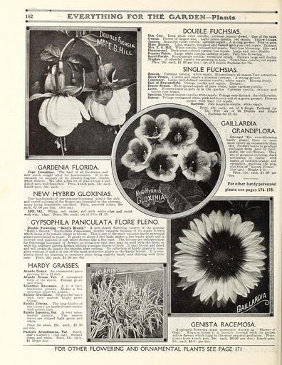 | Keywords: Everything for the garden (16203476098).jpg 162 <br> EVERYTHING FOiR THE GARB EM Plants <br> DOUBLE FUCHSIAS <br> Elm City Deep plum color corolla; crimson sepals; dwarf One of the best <br> Genius Flower of largest size Light prune corolla; red sepals Yellow foliage <br> Jussieu Beautiful violet corolla; carmine sepals A strong grower Fine in pots <br> Mme Bruant Lilac mauve streaked and veined with rose; red sepals Distinct <br> Mrs E G Hill White corolla; brilliant red sepals Very'free blooming See cut <br> Phenomenal Dark plum-colored corolla; red sepals Large and very double <br> Rozains Patrie Large white corolla carmine sepals Very free flowering <br> Royal-Purple Royal-purple corolla; Vermillion sepals Flowers large and double <br> Traphee A splendid variety for growing in pots Violet-blue corolla; red sepals <br> Price 10c each SI 00 per doz- ; set of 9 double Fuchsias for 75c <br> SINGLE FUCHSIAS <br> GARDENIA FLORIDA <br> Cape Jessamine The best of all Gardenias and <br> now much sought after for boutonnieres It is in- <br> valuable on account of its sweetly fragrant double <br> white flowers We offer a fine lot of plants from 4 and <br> 3-inch pots well branched Price 4-inch pots 75c each <br> 3-inch pots 50c each <br> NEW HYBRID GLOXINIAS <br> The handsomest of our summer-blooming plants the rich <br> and varied coloring of the flowers are beautiful in the extreme <br> many being beautifully speckled Price assorted colors 20c <br> each S2 00 per doz See cut <br> SPEv'TAL White red violet red with white edge and violet <br> with whu- edge Price 30c each; set of 5 for 11 25 <br> GYPSOPHILA PANICULATA FLORE PLENO <br> Double Flowering Baby's Breath A new double flowering variety of the popular <br> Baby's Breath Gypsophila Paniculate doubly valuable because of its double flowers <br> which cause it to remain longer in bloom This is one of the most valuable hardy perennial <br> plants introduced in years It grows to about 3 feet high makes a fine bushy plant and is <br> covered with panicles of soft white flowers like a fine mist The blooms are indispensable <br> for festooning bouquets of flowers so attractive that they may be used with the finest or <br> with the ordinary garden flowers lending a unique charm to both It may be cut and dried <br> and will retain its beauty for months after cutting No collection of hardy plants is com- <br> plete without it and it is one of the most attractive plants in the hardy border It is emi- <br> nently fitted for planting'in cemetery plots being entirely hardy and thriving with little <br> care Price 30c each 3 00 per doz <br> Beacon _ Carmine corolla; white sepals Blooms freely all season Very attractive <br> Black Prince Corolla and sepals a pleasing carmine A strong grower <br> Constancy Large well-defined carmine corolla; white sepals Blooms freely <br> Earl of Beaconsfield Orange corolla and sepals Distinct <br> Ernest Renan Wide spread sepals of pure white; large carmine corolla <br> Lottie Flowers freely in pots or in the garden Carmine corolla; delicate and <br> tender rose sepals <br> Speciosa Orange-scarlet corolla; white sepals Foliage very distinct An old favorite <br> Sunray Foliage variegated white pink and bronzy-red on a green ground Flowers <br> purple with waxy red sepals <br> Surprise Pale magenta corolla; white sepals <br> Price 10c each; set of 9 Single Fuchsias for <br> 5c Full set of 18 Double and Single <br> Fuchsias for 1 25 <br> GAILLARDIA <br> GRANDIFLORA <br> Amongst the ever-blooming <br> hardy plants there is none <br> more showy or ornamental than <br> this Flowers borne in prodigal <br> piofusion from June to frost <br> useful for cut flowers They <br> are of gorgeous coloring dark <br> red-brown in center with <br> bands of crimson-orange and <br> vermillion meriting the pop- <br> ular title of Aurora Flower <br> See cut Height 2 ft <br> Price 15c each 1 50 per <br> doz <br> For other hardy perennial <br> plants see pages 174-175 <br> HARDY GRASSES <br> Arundo Donax An ornamental grass <br> growing 10 or 12 feet <br> Arundo Donax Var A variegated <br> form of the above Foliage green <br> and white <br> Erianthus Ravennae 6 to 8 feet; <br> handsome plumes Makes a fine <br> specimen plant for a lawn <br> Eulalia Gracilliina Of graceful habit <br> with very narrow bright green <br> foliage <br> Eulalia Zebrina The long blades of <br> this variety are marked transversely <br> with golden bars <br> Eulalia Japonica Var A very orna- <br> mental variety The narrow <br> leaves are striped light green and <br> white <br> Price for above 25c each 2 50 <br> per doz <br> Phalaris Arundinacea Var Gard- <br> ener's Garters See cut Striped <br> tureen and white Price 15c each <br> SI 50 per doz <br> err <br> GENISTA RACEMOSA <br> A splendid flowering plant commonly known as Shower of <br> Gold When in bloom it is literally covered with its golden <br> yellow flowers which hang in the most graceful profusion Price <br> plants from 4-inch pots 30c each 3 00 per doz ; 5-inch pots <br> 50c each S5 0J per doz <br> FOR OTHER FLOWERING AND ORNAMENTAL PLANTS SEE PAGE 171 43874954 149634 78295 Page 162 Text http //www biodiversitylibrary org/page/43874954 c1915 10 5962/bhl title 78295 Henry G Gilbert Nursery and Seed Trade Catalog Collection ; Peter Henderson Co NameFound Arundinacea NameConfirmed Arundinacea Kunth 1815 NameBankID 5389572 NameFound Donax NameConfirmed Donax EOLID 45388 NameBankID 4934895 NameFound Erianthus NameConfirmed Erianthus EOLID 108084 NameBankID 465766 NameFound Eulalia NameConfirmed Eulalia EOLID 108151 NameBankID 652465 NameFound Gaillardia grandiflora NameConfirmed Gaillardia grandiflora EOLID 479475 NameBankID 3879185 NameFound Gardenia florida NameConfirmed Gardenia florida L EOLID 1102886 NameBankID 614846 NameFound Genista racemosa NameFound Gracilliina NameFound Gypsophila NameConfirmed Gypsophila EOLID 59327 NameBankID 2646576 NameFound Gypsophila paniculata NameConfirmed Gypsophila 