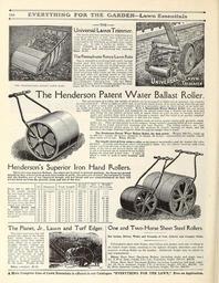 Keywords: Everything for the garden (16203744960).jpg 184 <br> 'OR TIE GARDEH <br> THE PENNSYLVANIA ROTARY LAWN RAKE <br> THE <br> Universal Lawn Trimmer <br> The latest and best machine for trimming grass <br> close up to the fence or wall thus reducing hand <br> work with shears to a minimum It will also be <br> found handy for trimming up around trees under <br> bushes etc It cuts 6 inches in width This <br> Lawn Trimmer is a high-grade machine in <br> every respect with self-adjusting ball bearings <br> Price 4 50 <br> The Pennsylvania Rotary Lawn Rake <br> This is virtually a revolving lawn comb having <br> flexible steel wire teeth which go between the <br> blades of grass and comb out all dead grass crab <br> grass leaves sticks and other rubbish It leaves <br> the grass standing upright The action of the <br> three revolving rakes raises up the creeping crab <br> grass and other low growing weeds so the lawn <br> mower can cut them before going to seed thus <br> effectually ridding the lawn of annual weeds _ It <br> has a dumpable collecting box See cut Price <br> 24-inch machine 16 00 Weight packed for ship- <br> ment 90 lbs 36 inch machine S25 00 <br> llllllllllllllll <br> I ” ' <br> The Henderson Patent Water Ballast Roller <br> The advantages of a roller the weight of which can be increased or lightened at pleasure can scarcely <br> be over estimated Often on light or sandy soil or on newly made lawns or in early spring when the ground <br> is moist or after a rainy spell a lighter-weight roller is a necessity; then on thick sward or on hard soil <br> on walks and roads a heavy roller is needed With a Henderson Water Ballast Roller one can secure <br> any weight desired between minimum and maximum by simply removing a thumb-cap from each end <br> and filling the two hollow sections with as much water or sand as may be needed which is <br> easily and quickly done with a hose or through a funnel ; and the roller is as quickly emptied <br> The inside being heavily galvanized it will last for years <br> These are perfect rollers and do perfect work on lawns tennis courts golf grounds roads <br> walks etc They are high grade in every respect being carefully manufactured of best material <br> They will be found practically noiseless and very durable The rolling surfaces are very <br> smooth and will not gather grass or soil; the sections fit closely leaving no mark and the <br> diameters are large insuring a lighter draft for a given weight than is usual <br> The Henderson Patent Water Ballast Roller for man power Weighs 300 lbs ; loads up <br> to 600 lbs ; tracks 24 inches diameter of drums 24 inches; counterbalanced handle stands <br> erect when not in use Price 25 00 <br> The benefit derived from using a roller on the lawn is inestimable ” and the heavier the roller <br> the better Freezing and thawing causes sod-ground to heave also too liberal-watering with force <br> washes soil from the roots of the grass ” in either <br> event if the sod is not pressed down the grass <br> is apt to be burned out or injured in hot weather <br> leaving the lawn full of bad spots A lawn on <br> which a roller is used is never troubled with <br> moles <br> Henderson's Superior Iron Hand Rollers <br> These are very superior Rollers; the edges are beveled to prevent marking; the faces are ground <br> smooth so they will not pick up and carry lumps of earth; the axles are of steel; the sections fit closely <br> end the handles are of our improved design will not break and are counterbalanced so they will <br> always keep up from the ground clean and out of the way <br> Actual <br> Net <br> Weight <br> No <br> Diameter <br> Tota <br> Length <br> Weight <br> Prices <br> Box extra <br> From 300 to 500 lbs <br> is the weight chosen <br> 1 <br> 15 inches <br> 15 in <br> in 2 sec <br> 150 lbs <br> 8 25 <br> for one-man power for <br> 2 <br> 15 <br> 22 <br> in 3 <br> 200 <br> 10 50 <br> average level lawns <br> 3 <br> 20 I' <br> 16 <br> in 2 <br> 225 <br> 12 00 <br> Remember that the <br> 4 <br> 20 <br> 20 <br> in 2 <br> 250 <br> 13 00 <br> 5 40 <br> heavier the roller used <br> 5 <br> 20 <br> 20 <br> in 1 <br> 250 <br> 13 00 <br> 5 40 <br> on your lawn the finer <br> 6 <br> 20 <br> 24 <br> in 3 <br> 300 <br> 15 00 <br> 5 60 <br> sward you will have <br> 8 <br> 20 <br> 30 <br> in 3 <br> 350 <br> 18 00 <br> 5 85 <br> Weight Boxes can <br> 9 <br> 24 <br> 20 <br> in 2 <br> 400 <br> 21 00 <br> 6 00 <br> be supplied on any <br> 11 <br> 24 <br> 24 <br> in 3 <br> 450 <br> 22 00 <br> 6 30 <br> roller larger than num- <br> 12 <br> 24 <br> 30 <br> in 3 <br> 500 <br> 25 50 <br> 6 50 <br> ber 3 at an extra price <br> 14 <br> 28 <br> 24 <br> in 3 <br> 500 <br> 25 50 <br> 6 50 <br> as quoted <br> 15 <br> 28 <br> 30 <br> in 3 <br> 600 <br> 30 00 <br> 7 00 <br> 16 <br> 28 <br> 32 <br> in 4 <br> 650 <br> 32 50 <br> 7 25 <br> 17 <br> 28 <br> 36 <br> in 3 <br> 700 <br> 36 00 <br> 7 50 <br> The Planet Jr Lawn and Turf Edger <br> This little tool trims the turf <br> around the edges of the flower <br> beds walks roads etc ; the <br> revolving cutter does perfect <br> work either on a curved or <br> straight border edging ac- <br> curately at just the correct <br> angle and at the speed of a <br> mile an hour while the hoe <br> cleans the bottom of walk <br> The hoe can be removed if <br> desired It is invaluable in <br> giving a finished appearance <br> to the lawn Weighs 26 lbs <br> Price complete 6 25 <br> mum <br> Bill <br> rv /~ ii/; <br> <br> One and Two-Horse Sheet Steel Rollers <br> For Lawns Drives Walks and Grounds of Golf Athletic and Country Clubs <br> Unbreakable sheet steel drums steel felloes and spokes; steel axle working in <br> oil soaked maple boxes resulting in the lightest draught smoothest and most <br> noiseless working Roller on the market Additional weight may be added to <br> suit requirements <br> Prices Sheet Steel One-horse Rollers including shafts and single tree <br> No 2 24 in diam ; trac