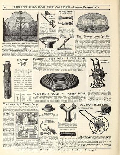 | Keywords: Everything for the garden (16203748790).jpg Henderson's 4-Arm and 8'Arrn Lawn Sprinklers <br> A standard about 4 r eet high is surmounted with <br> long perforated arms which revolve so the beautiful <br> sprays are constantly changing Prices for a 4-arm <br> sprinkler S3 00; for an 8-arm 3 50 <br> Ball and Basket Attachment extra S3 00 This fits <br> en top of the Henderson sprinkler and the stream of <br> water keeps the silvered ball dancing on its summit up <br> In the air When the ball falls the basket catches it and <br> It rollsinto the center and is again raised by the water <br> The holes are small and nu- <br> merous so that a copious yet <br> gentle shower is given without <br> washing or packing the soil <br> Price for -in hose 3 in <br> face 8oc ; t-in face 1 10 Add <br> extra for P P weight 1 lb <br> For watering lawns flower <br> beds etc The hose is held <br> firmly and can be adjustedto <br> any elevation Add extra <br> for ParcelPost weight 1 lb <br> The Shower Lawn Sprinkler <br> One of the most satisfactorv lawn sprinklers we <br> offer It is very simple ” no parts to revolve squeak <br> clog wear or get out of order No arms to break off <br> It is a round box-like affair ” about 3 inches in dia- <br> meter by 1 inch in depth with a turbine arrange- <br> ment inside which gives the water passing through <br> a swirl causing it to pass through the single opening <br> and be distributed over a circular area 25 f et or <br> more in diameter according to the water pressure <br> The water descends evenly from center to circum- <br> ference in the form of fine rain Price on stand <br> S2 50 add extra for Parcel Post; weight i lb ; without <br> stand to be used as a nozzle 1 25 add extra fox <br> Parcel Post; weight 1 lb <br> ELECTRIC <br> GARDEN <br> HOSE <br> Electric Garden Hose <br> isn't a duck wrapped <br> hose but built up from <br> the inside to the wrapper <br> in such a way as to insure <br> maximum service Elec- <br> tric Hose will not burst <br> crack or split Is made of <br> seamless seine twine jack- <br> ets and rubber tubes Prices <br> including couplings <br> Bore <br> lm <br> lin <br> Length <br> 25 ft <br> 50 ft <br> 25 ft <br> 50 ft <br> Price <br> i 5 00 <br> 9 50 <br> 7 00 <br> 13 00 <br> Henderson's BEST PARA RUBBER HOSE <br> This is the highest grade of garden hose being made entirely from New Para <br> Rubber and will outlast cheap hose three times over We guarantee it to <br> ; tand a' 300-pound water pressure and it will be as resilient in three or four <br> years' time as when new while cheap hose of that age will be hard and rotten <br> Every length of Henderson's Best Para Hose is fitted with the new water- <br> tight couplings without extra charge Hose is furnished only in 25-feet and <br> 50 feet lengths- the sizes I and 1 inch refer to the internal diameter of the bore <br> §-inch bore Para per 25-foot length S4 25 per 50-foot length 8 00 <br> 1-inch bore Para per 25-foot length 6 50; per 50-foot length 12 00 <br> STANDARD QUALITY RUBBER HOSE <br> This is a grade that is often sold as the best It is a good hose ana win <br> stand a 100-pound pressure Each length is fitted with the regular couplings <br> without extra charge For \-inch Spray Pump Hose and Tubing see foot of p 196 <br> -inch Standard per 25 -foot length S3 00; per 50-foot length 5 75 <br> 1-inch Standard per 25-foot length 4 25; per 50-foot length 8 00 <br> BENT LEG <br> HOSE REEL <br> The best wooden reel made ” <br> not easily tipped over The <br> ratchet prevents unwinding un- <br> l ess it is desired to throw back <br> the clutch <br> No A for 100 feet of J-in <br> Hose 2 25 <br> No B for 200 feet of J-in <br> Hose 2 50 <br> The Kinney Liquid Manure Pump <br> For applying liquid manure to feed grass and <br> garden plants this pump has no equal Being made <br> entirely of brass and nickel plated these pumps are <br> not corroded by chemicals and they do not wear out <br> Remember that <br> the water pres- <br> sure does the <br> pumping and <br> that the flow of <br> liquid fertilizer <br> through the hose <br> diluted about <br> one-half is even <br> and continuous <br> as long as liquid <br> is reasonably <br> clear and there <br> is water pressure <br> behind it It <br> will apply from <br> 5 to 15 gallons of <br> liquid fertilizer a <br> minute There <br> is no waste You <br> screw the pump <br> to the faucet put <br> the end of the <br> suction hose into a barrel or tank of clear liquid ma- <br> nure attach the three-fourths inch discharge hose <br> open the faucet and go to the end of the hose The <br> liquid manure follows and will keep coming as long <br> as you want it or until the supply is exhausted Price <br> 31 75 Add extra for Parcel Post; weight 1 lb <br> Hose Reducer <br> For connecting hose of <br> 1 in bore with J-in mailed <br> free 30c <br> HUDSON'S <br> HOSE MENDER <br> Practical simple perfect <br> Box of 6 tubes 20 bands and <br> pliers 75c Add extra for <br> Parcel Post weight 1 lb <br> Give size of Hose <br> Tubes j-in 3c; 1 in <br> 4c each <br> Bands 20c per doz <br> Pliers 30c Add extra for <br> Parcel Post weight 1 lbs <br> For connecting 2 leads of <br> hose Price J-in 60c; 1-in <br> 75c Add extra for Parcel <br> Post weight 1 lb each <br> Cooper Hose Mender <br> Brass; will not rust or <br> wear No fastening required; <br> barbs hold hose firm Price <br> for hose with -in bore 7c <br> each 75c doz ; 1 in 8c <br> each 85c doz Add extra <br> for Parcel Post; weight 1 Ik <br> – doz <br> ALL IRON HOSE REEL <br> Note position for reel- <br> ing and unreeling hose <br> Tke All Iron Hose Reels are constructed en- <br> tirely of iron a«d are indestructible light in <br> weight frictionless and the wheels being high <br> make it easily manipulated; these reels can- <br> not tip over when unreeling and there is no <br> weight of hose to carry on the haadle <br> No 10 21-in wheels holds 100 ft J-in hose 3 25 <br> No 20 24 150 3 5 <br