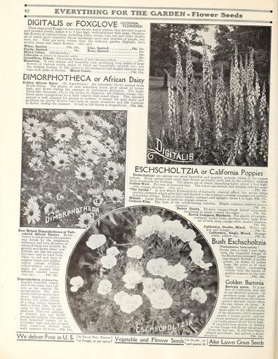 | Keywords: Everything for the garden (16390939795).jpg – <br> 92 <br> EVERYTHING FOR TIE <br> DIGITALIS or FOXGLOVE G F L L o x « ED <br> and p e r S oXf fTe spfkel 6 'oYfeTnX ' Pla the l to „¢ <br> roon etc TW a ~ autiful throat markings spots and blotches of purple ma <br> M ixed Colors Gloxinoides j \ R ° Se ' Sp ° tted J - <br> Collection of above 4 separate sorts ' „¢ <br> Mo a nstrosa a ' 1° Charmin g /owers of soft chrome'-yel'low '; '; ' foe' <br> 1S Sit S3ci«;T~ ' b - ibl ° a« <br> DIMORPHOTHECA or African Daisy <br> - – <br> ESCHSCHOLTZIA or California Poppies <br> Eschscholtzias are amon o žr mr f k_ ; _ z 11 / 1 ' U PP 1 i <br> ut 1 foot high <br> some <br> New Hybrid Dimorphothecas or Van <br> colored African Daisies Every <br> visitor to our grounds this summer <br> was struck by the brightness <br> brilliancy and rich diversity of <br> colors of these new hybrids In <br> growth and flower these new <br> hybrids are like the parent <br> but they vary in color from <br> white to red and tints of <br> sulphur lemon and golden- <br> yellow orange reddish- <br> yellow-salmon shades- <br> many are marked with' <br> different colored zones <br> See cut Pkt 10c <br> Dimorphotheca s i n u a t a <br> Equally beautiful useful <br> and of the same easy cul- <br> ture as the original Di- <br> morphotheca this new <br> South- African species pro- <br> duces singularly pretty <br> flowers 2y 2 inches across <br> of a clear satiny chamois <br> with a bluish disk; the re- <br> verse of the petals is pur- <br> phsh-red This rare coloring <br> is distinct and not found <br> among the hybrids The plants <br> form branched bushes 12 to <br> 15 inches high and are covered <br> with numerous flowers from <br> early summer till frost Pkt 15c <br> We deliver Free in U S <br> cul ure SCh pTom S sp a ring a -rw n n g sTedsThey ower W T t <br> them invaluable for bidding The plants are nf £ U /f\ Untl U at \ ln J he autu „¢ ' ' ; ~ <br> Golden West Flowers of immense ; ž ti of dwarf ' branching habit about 1 foe <br> with orange blotches S „¢ecut colors are intense and shining yellow <br> P Tcrim <br> _ rich golden within Habit of plant bush v 7 t0 e br i Ulan - t coloring ” orange-red outride <br> sea; K r bffoflEI 1 - 3 „¢ - ¢ about - 1 - PkL it <br> carmfn; W6nng Van6tieS - Bdght crimson ' ri°r sating <br> Dainty 'Queen ' ' Rowers ' ¢'creamy'-biush 'tinted' cofal-pink' <br> deepening m shade toward the edges Pkt 10c' <br> Erecta Compacta Mandarin The plants'/of upright' <br> compact bushy form produce freely large flow- <br> ers of rich deep orange color shaded crimson <br> Pkt 10c <br> Californica Double Mixed White yel- <br> low and orange pki 5 C <br> Californica Single Mixed ' Orange <br> white yellow etc Pkt 5c ' <br> Bush Eschscholtzia <br> Hunnemannia fumariaefolia <br> Grows into a bush 2 feet high <br> with the beautiful foliage of <br> the Escholtzia enlarged Large <br> cup-shaped flowers 3 inches <br> across on stems 12 inches <br> long; the color is of clear <br> bright yellow contrasting <br> vividly with the bunch of <br> golden stamens in the cen- <br> ter pkt 10c <br> Golden Bartonia <br> Bartonia aurea Is a na- <br> tive of California and one <br> of our showiest annuals It <br> produces large single gold- <br> en-yellow flowers which have <br> quite a metallic lustre when <br> the sun shines on them A <br> large cluster of vellow sta- <br> mens adds to the effectiveness <br> of the blossoms which measure <br> nearly 3 inches across and are <br> borne profusely all summer long <br> on bushy plants about 1 foot high <br> t succeeds best grown in masses <br> the foliage will shelter the ground <br> n the hot sun It will then thrive <br> st anywhere but prefers a moist <br> situation pkt 10c <br> /by Parcel Post Express \/ d ž_ I r- situation Pkt 1Q C <br> U r Freigh « our Bption j Vegetable and Flower Sk J – – ~4 Also Uwn Grass Sgeds 43874884 149634 78295 Page 92 Text http //www biodiversitylibrary org/page/43874884 c1915 10 5962/bhl title 78295 Henry G Gilbert Nursery and Seed Trade Catalog Collection ; Peter Henderson Co NameFound Bartonia NameConfirmed Bartonia EOLID 71002 NameBankID 2653229 NameFound Bartonia aurea NameConfirmed Bartonia aurea EOLID 6856826 NameBankID 3409117 NameFound Californica NameConfirmed Californica NameBankID 5111404 NameFound Compacta NameConfirmed Compacta EOLID 10934908 NameBankID 2627020 NameFound Dimorphotheca NameConfirmed Dimorphotheca EOLID 62701 NameBankID 2658462 NameFound Escholtzia NameConfirmed Escholtzia NameBankID 3478697 NameFound Eschscholtzia NameConfirmed Eschscholtzia EOLID 2886433 NameBankID 2560248 NameFound Hunnemannia fumariaefolia NameConfirmed Hunnemannia fumariaefolia EOLID 597000 NameBankID 1672473 Biodiversity Heritage Library Everything for the garden 1915 Garden Stories Books Bulbs Plants Catalogs Equipment and supplies Flowers Gardening Lawn mowers Seeds U S Department of Agriculture National Agricultural Library bhl page 43874884 dc identifier http //biodiversitylibrary org/page/43874884 bhlGardenStories BHLinbloom bulbs plants u s department of agriculture national agricultural library bhlgardenstories bhlinbloom Information field Flickr posted date ISOdate 2015-01-28 Check categories 2015 August 25 CC-BY-2 0 BioDivLibrary https //flickr com/photos/61021753 N02/16390939795 2015-08-25 02 52 47 cc-by-2 0 PD-old-70-1923 Everything for the garden 1915 Photos uploaded from Flickr by Fæ using a script |