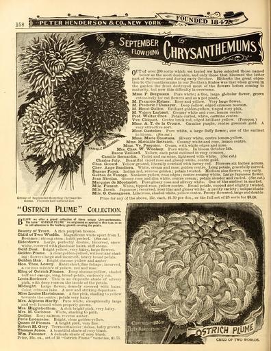 | Keywords: Everything for the garden (16646967447).jpg 158 <br> PETER HENDERSON fltCO l\EW YORK- <br> T5 5 <br> ;yii « <br> Ti September <br> f Lowering <br> E <br> 0' <br> <br> © <br> // <br> Group of Sept <br> muma F <br> ember-flowerinp Chrysanthe- <br> lowerB halt natural size <br> \UT of over 200 sorts which we tested we have selected those named <br> below as the most desirable and only those that bloomed the latter <br> part of September and during early October Hitherto the great objec- <br> tion to Chrysanthemums in our Northern States was that when grown In <br> the garden the frost destroyed most of the flowers before coming to <br> maturity but now this difficulty is overcome <br> Mme F Bergmann Pure white; a fine large globular flower grown <br> extensively for cut flowers and as a pot plant <br> M Francois Katzer Kose and yellow Very large flower <br> M Frederic I'Usmayer Deep yellow edged crimson maroon <br> M Henri Galice Brilliant golden-yellow tinged rosy pink <br> M Valery Larbaut Creamy white and rose lemon centre <br> Prof Welter Croz Petals curled white carmine centre <br> Vve Chiquot Centre brick red edged brilliant yellow Pompon <br> Mme A T de la Croure Carmine purple centre greenish gold A <br> very attractive sort <br> Mme Gastelier Pure white a large fluffy flower; one of the earliest <br> to bloom See cut <br> Mme Marie Coustans Silvery white centre lemon-yellow <br> Mme Mathilde Bettzich Creamy white and rose lemon centre <br> - - p Mme Ve Pasquier Cream with white edges and rose <br> CAm\Xt Mrs Chas W – Woolsey Pure white In bloom October 5th <br> Baron Veillard Yellow each petal outlined in rosy crimson <br> Camilla Bernardin Violet and carmine lightened with white See cut <br> Charles Joly Beautiful violet rose and glossy white centre gold <br> Chas Greard Yellow ground liberally overlaid with tawny red Flowers six inches across <br> Chev Ange Bandiera White cream and rose golden centre Long petals gracefully curved <br> Eugene Farez Indian red reverse golden ; petals twisted Medium size flower very early <br> Gaetan de Venoge Nankeen yellow rose edges ; centre creamy white Large Japanese flower <br> Jean Nicolas Glossy rose and dim white centre cream ; petals slender and curled See cut <br> Marquise de Montmort Pure glossy rose and silvery white One of the earliest in market <br> Mile Fleurot White tipped rose yellow centre Broad petals cupped and slightly twisted <br> Mile Jacob Japanese; recurved rosy lilac and glossy white A pretty variety ; unique shade <br> Mile G Cassagneau Lilac rose shaded white yellow centre Preony-flowered large and double <br> Price for any of the above 15c each 1 50 p r do/ or the full sot of 25 sorts for 3 00 <br> itJ <br> Ostrich Plume collection <br> B <br> ELOW we offer a grand collection of those unique Cbrysantbemums <br> The term ' ' OSTRICH PLUME we originated as applied to this type so as <br> to call attenlioo to the feathery growth covering the petals <br> Beauty of Truro A rich purplish bronze <br> Child of Two Worlds Magnificent white sport from L <br> Boehmer ; strong stem ; habit perfect See cut <br> Eiderdown Large perfectly double Incurved snow- <br> white covered with glandular hairs stiff stems <br> Gold Dust Bright yellow very hairy large flowers <br> Golden Plume A clear golden-yellow- without aoy shad- <br> ing ; flowers large and incurved heavy broad petals <br> Golden Hair Bright chrome-yellow and amber <br> Hon Thos Lowry Habit short fine foliage ; incurved <br> a curious mixture of yellow red and rose <br> King of Ostrich Plumes Deep chrome-yellow shaded <br> buff and OBatige long broad petals curiously cut <br> Louis Boehmer This is an exquisite shade of silvery <br> pink with deep rose on the inside of the petals <br> Midnight Large flower densely covered with hairs <br> Color crini ou lake A new and striking departure <br> Miss Louise Hartshorne A fine pink shading to yellow <br> towards the centre ; petals very hairy <br> Mrs Alpheus Hardy Pure white exceptionally large <br> and well formed when properly grown <br> Mrs Higginbotham A rich bright pink very hairy <br> Mrs M Carbone White shading to pink <br> Ondine Rosy salmon reverse amber <br> Perle Lyonnaise Bright clear golden-yellow <br> Queen of Plumes A bright pink very fine <br> Robert M Grey Terra cotta color ; dense hairy growth <br> Thomas Jones A beautiful shade of rosy blush <br> Wm Falconer A delicate shade of rosy blush <br> Price 10c ea set of 20 Ostrich Plume varieties 1 75 <br> GUILD OF TWO WORLDS 42383247 133997 66553 Page 158 Text http //www biodiversitylibrary org/page/42383247 1902 10 5962/bhl title 66553 Henry G Gilbert Nursery and Seed Trade Catalog Collection ; Peter Henderson Co NameFound Alpheus NameConfirmed Alpheus EOLID 10949413 NameBankID 2706115 NameFound Camilla NameConfirmed Camilla EOLID 55182 NameBankID 379667 NameFound Lilac NameConfirmed Lilac P Miller 1754 NameFound Medium NameConfirmed Medium NameBankID 4904049 Biodiversity Heritage Library Everything for the garden 1901 Garden Stories Catalogs Flowers Peter Henderson Co Plants Ornamental Seed industry and trade Seeds Trade catalogs U S Department of Agriculture National Agricultural Library bhl page 42383247 dc identifier http //biodiversitylibrary org/page/42383247 bhlGardenStories Chrysanthemums Ostrich Plume BHLinbloom peter henderson co plants ornamental u s department of agriculture national agricultural library bhlgardenstories ostrich plume bhlinbloom Information field Flickr posted date ISOdate 2015-03-18 Check categories 2015 August 24 CC-BY-2 0 BioDivLibrary https //flickr com/photos/61021753 N02/16646967447 2015-08-24 20 54 33 cc-by-2 0 PD-old-70-1923 Everything for the garden 1902 Photos uploaded from Flickr by Fæ using a script |