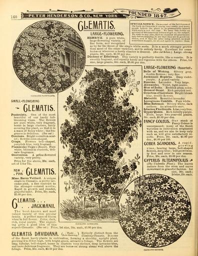 | Keywords: Everything for the garden (16646972287).jpg 160 <br> ¢PETER HENDERSON fit CO NEW YORK- <br> SPECIAL NOTICE Onnrcount of the brittlenessot <br> the bark on Clematis it crncks very easily and many <br> people believe the plant to be permanently iujuiert <br> when such is not the case We issue this notice on <br> accountof the numerous letters weget on tlie subject <br> We wish to say also thatwe examine all plantscare- <br> fully before shipping to see that they are in good con- <br> dition and if they die after being planted as must <br> sometimes happen ne do not agree to replace tbem <br> CLEMATIS PANICULATA <br> SMALL-FLOWERING <br> <br> GLEMftTIS <br> Paniculata One of the most <br> beautiful of our hardy fall- <br> blooniing vines The flowers <br> are pure wiiite very fragrant <br> borne in large clusters fairly <br> covering the plant so that it is <br> a mass of fleecy white; the fra- <br> grance is delicious See cut <br> Coccinea Bright vermilion-scar- <br> let; flowers cone-shaped <br> Crispa Flowers bell- shaped <br> purplish blue very fragrant <br> Flammula Virgin's Bower Pure <br> white blooms in clusters deli- <br> cate fragrance <br> Graveolens A yellow-Ao-wered <br> variety very pretty <br> Price for the above 20c each <br> set of 5 for 75c <br> NEW <br> PINK <br> GLEMftTIS <br> Mme Baron Veillard A unique <br> shade in Clematis a pretty lav- <br> ender-pink a fine contrast to <br> the stronger -colored sorts <br> Eapid in growth and slender <br> graceful habit Price 50c each <br> 5 00 per doz <br> GLEMftTIS <br> JflGKMMlI <br> The best-known and most <br> valued variety of this popular <br> family A perfect mass of bloom <br> when in full flower Color dark <br> rich royal purple The engrav- <br> ing gives a good idea of this <br> superb Clematis See cut Price let size 50c each 5 00 per doz <br> CLEMATIS DflVIDIflNfl <br> LflRGt-FLOWERlNG <br> HENRYII A pure white <br> large-flowering variety of <br> fine form and recognized <br> as by far the finest of the single white sorts It is a much stronger grower <br> tlian most of the other varieties and is entirely hardy Excellent for ceme- <br> teries or wherever a hardy climber is desired See cut below Large strong <br> plants 50c each 5 00 per doz /be <br> Duchess of Edinburgh This variety is perfectly double like a rosette It is <br> sweetly fragrant and equally hardy and vigorous with the others Price 1st <br> size large plants 50c each 5 00 per doz <br> LflRGE-FLOWERING Assorted <br> Belle of Woking Silvery gray <br> double flowers ; very fine <br> Jackmanii Superba Deep violet- <br> purple A grand variety <br> Ramona Lavender Very large <br> Alexandra Violet light centre <br> Star of India Reddish plum color <br> General Grant Rich purplish red <br> Countess of Lovelace Bright bluish <br> ilac double flowers <br> Sleboldii Beautiful lavender <br> Lanuginosa Candida Pure white <br> Miss Bateman Silvery white dark <br> anthers An attractive sort <br> Lilacina Floribunda Lilac very free <br> Gypsy Queen Eieh velvety purple <br> Price large two-year-old plants <br> 50c each 5 00 per doz <br> fflNGyC0LEUS o-4tru i <br> unsurpassed; many of the finest <br> varieties in cultivation originated <br> with us and we aim to keep only <br> such as will give satisfactory re- <br> sults Price 10c each 1 00 per <br> doz S6 00perl00 <br> GOBEft SGftNDENS - 'g <br> vine bearing large bell-shaped <br> flowers deep blue ; will grow twen- <br> ty feet and over in one season <br> Price 20c each 2 00 per doz <br> GYPERUS ftLTERNIFOLlUS - <br> The Umbrella Plant The leaves <br> radiate from the stem and curve <br> downward in graceful fashion 1st <br> size 30c each ; <br> 2dsize 15c each <br> 'Hardy N <br> iring J <br> Entirely distinct from the <br> Low-Growing / Climbing Clematis It is one <br> of the finest hardy plants in cultivation forming a shrubby upright plant <br> growing 2 to 3 feet high with bright green attractive foliage The flowers are <br> long tubular bell-shaped borne in clusters very distinct deep lavender-blue <br> and have delicious fragrance They are borne on strong stems weU above the <br> foliage Price 25c each 2 50 per doz <br> CLEMATIS HENEYU 42383249 133997 66553 Page 160 Text http //www biodiversitylibrary org/page/42383249 1902 10 5962/bhl title 66553 Henry G Gilbert Nursery and Seed Trade Catalog Collection ; Peter Henderson Co NameFound Alexandra NameConfirmed Alexandra EOLID 11855105 NameBankID 1842495 NameFound Candida NameConfirmed Candida EOLID 32103 NameBankID 2560655 NameFound CLEMATIS NameConfirmed Clematis ser Alpina W J Yang L Qian Li EOLID 38289 NameFound Clematis paniculata NameConfirmed Clematis paniculata EOLID 11205608 NameBankID 2778766 NameFound Coccinea NameConfirmed Coccinea Feuillet J M MacDougal supersect NameBankID 9261559 NameFound Flammula NameConfirmed Flammula EOLID 6688969 NameBankID 242750 NameFound Floribunda NameConfirmed Floribunda EOLID 5190123 NameBankID 3474597 NameFound Lanuginosa NameFound Lilac NameConfirmed Lilac P Miller 1754 NameFound Lilacina NameFound Paniculata NameFound Superba NameConfirmed SUPERBA NameBankID 5322983 Biodiversity Heritage Library Everything for the garden 1901 Garden Stories Catalogs Flowers Peter Henderson Co Plants Ornamental Seed industry and trade Seeds Trade catalogs U S Department of Agriculture National Agricultural Library bhl page 42383249 dc identifier http //biodiversitylibrary org/page/42383249 bhlGardenStories Clematis BHLinbloom peter henderson co plants ornamental u s department of agriculture national agricultural library bhlgardenstories bhlinbloom Information field Flickr posted date ISOdate 2015-03-18 CC-BY-2 0 BioDivLibrary https //flickr com/photos/61021753 N02/16646972287 2015-08-24 20 57 40 cc-by-2 0 PD-old-70-1923 Everything for the garden 1902 Photos uploaded from Flickr by Fæ using a script |