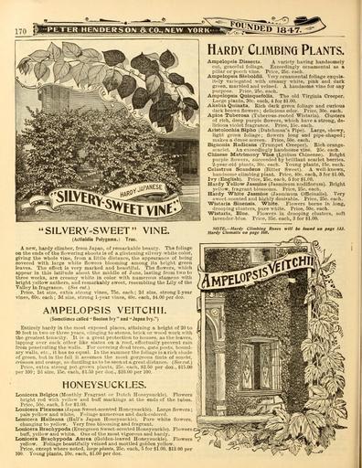 Keywords: Everything for the garden (16646997877).jpg 5 <br> 170 <br> ˘PETER HENDERSON a CO NEW YORK <br> Hardy Climbing Plants <br> Ampelopsis Dissecta A variety having handsomely <br> cut graceful foliage Exceedingly ornamental as a <br> pillar or porcli vine Price 25c each <br> Ampelopsis Sieboldii Very ornamental foliage exquis- <br> itely variegated with creamy white pink and dark <br> green marbled and veined A handsome vine for any <br> purpose Price 25c each <br> Ampelopsis Quinquefolia The old Virginia Creeper <br> Large plants 30c each i for 1 00 <br> Akebia Quinata Rich dark green foliage and curious <br> lark brown flowers; delicious odor Price 30c each <br> Apios Tuberosa Tuberous-rooted Wistaria Clusters <br> of rich deep purple flowers which have a strong de- <br> licious violet fragrance Price 15c each <br> Aristolochia Sipho Dutchman's Pipe Large showy <br> light green foliage ; flowers long and pipe-shaped ; <br> makes a dense screen Price 50c each <br> Bignonia Radicans Trumpet Creeper Rich orange- <br> scarlet An exceedingly handsome vine 25c each <br> Chinese Matrimony Vine Lycium Chinense Bright <br> purple flowers succeeded by brilliant scarlet berries <br> 2-year-old plants 30c each Young plants 15c each <br> Celastrus Scaudens Bitter Sweet A well-known <br> handsome climbing plant Price 40c each 3 for 1 00 <br> Ivy English Price 25c each 5 for 1 00 <br> Hardy Yellow Jasmine Jasminum nudiflorum Bright <br> yellow fragrant blossoms Price 25c each <br> Hardy White Jasmine Jasminum Officinalis Very <br> sweet-scented and highly desirable Price 25c each <br> Wistaria Sinensis White Flowers borne in long <br> droojiing clusters pure wliite Price 50c each <br> Wistaria Blue Flowers in drooping clusters soft <br> lavender-blue Price 35c each 3 for SI 00 <br> SILVERY SWEET VINE <br> Actiaidia Polygama True <br> A new hardy climber from Japan of remarkable beauty The foliage <br> on the ends of the flowering shoots is of a glistening silvery-white color <br> giving the whole vine from a little distance the appearance of being <br> covered with large white flowers blooming among its bright green <br> leaves The effect is very marked and beautiful The flowers which <br> appear in this latitude about the middle of June lasting from two to <br> three weeks are creamy wliite in color with numerous stamens with <br> bright -ellow anthers and remarkablj' sweet resembling the Lily of the <br> Valley in fragrance See cut <br> Price 1st size extra strong vines 75c each ; 2d size strong 2-year <br> vines 60c each ; 3d size strong 1-year vines -lOc each S4 00 per doz <br> AMPELOPSIS VEITCHII <br> Sometimes called Boston Ivy and Japan Ivy <br> Entirely hardy in the most exposed places attaining a height of 20 to <br> 30 feet in two or three years clinging to stones brick or wood work with <br> the greatest tenacity It is a great protection to houses as the leaves <br> lapping over each other like slates on a roof effectually prevent rain <br> from penetrating the walls For covering dead trees gate posts bound- <br> ary walls etc it has no equal In the summer the foliage is a rich shade <br> of green but in the fall it assumes the most gorgeous tints of scarlet <br> crimson and orange so dazzling as to be seen at a great distance See cut <br> Price extra strong pot-grown plants 25c each 2 50 per doz 15 00 <br> per 100 ; 2d size 15c each 1 50 per doz 10 00 per 100 <br> HONEYSUCKLES <br> Lonicera Belgica Monthly Fragrant or Dutch Honeysuckle Flowers <br> bright red with yellow and buff markings at the ends of the tubes <br> Price 50c each 5 for 2 00 <br> Lonicera Flexuosa Japan Sweet-scented Honeysuckle Large flowers ; <br> pale yellow and white Foliage numerous and dark-colored <br> Iionicera Halleana Hall's Japan Honeysuckle Pure white flowers <br> changing to yellow Very free blooming and fragrant <br> Lonicera Brachypoda Evergreen Sweet-scented Honeysuckle Flowers C <br> buff yellow and white One of the most vigorous and hardy Cl <br> Lonicera Brachypoda Aurea Golden-leaved Honeysuckle Flowers V <br> yellow Foliage beautifully veined and mottled golden yellow <br> Price except where noted large plants 25c each 5 for 1 00 12 00 per <br> 100 Young plants lOe each 1 00 per doz <br> NOTE ” Hardy Climbing Roses will be ouad on page 133 <br> Hardy Clematis on page 160 42383259 133997 66553 Page 170 Text http //www biodiversitylibrary org/page/42383259 1902 10 5962/bhl title 66553 Henry G Gilbert Nursery and Seed Trade Catalog Collection ; Peter Henderson Co NameFound Akebia NameConfirmed Akebia Decne EOLID 61057 NameFound Ampelopsis NameConfirmed Ampelopsis Michx EOLID 59273 NameFound Ampelopsis veitchii NameConfirmed Ampelopsis veitchii NameBankID 5893640 NameFound Apios NameConfirmed Apios EOLID 28882 NameBankID 2650415 NameFound Aristolochia NameConfirmed Aristolochia aff ringens 2283 EOLID 11921687 NameFound Bignonia NameConfirmed Bignonia L EOLID 70924 NameFound Brachypoda NameConfirmed Brachypoda EOLID 279 NameBankID 2696213 NameFound Celastrus NameConfirmed Celastrus EOLID 50553 NameBankID 2651753 NameFound CLEMATIS NameConfirmed Clematis ser Alpina W J Yang L Qian Li EOLID 38289 NameFound Flexuosa NameConfirmed Flexuosa NameBankID 5100695 NameFound Jasminum NameConfirmed Jasminum EOLID 61788 NameBankID 2655499 NameFound Jasminum nudiflorum NameConfirmed Jasminum nudiflorum EOLID 487208 NameBankID 2667662 NameFound Lonicera NameConfirmed Lonicera EOLID 60796 NameBankID 2657168 NameFound Lycium NameConfirmed Lycium EOLID 11196477 NameBankID 2653612 NameFound Polygama NameFound Quinata NameConfirmed Quinata NameBankID 4719227 NameFound Quinata NameConfirmed Quinata NameBankID 4899097 NameFound Quinquefolia NameFound Sipho NameConfirmed Sipho EOLID 16239689 NameBankID 4344323 NameFound TUBEROSA NameConfirmed Tuberosa NameBankID 4880980 NameFound Wistaria NameConfirmed Wistaria NameBankID 8859180 Biodiversity Heritage Library Everything for the garden 1901 Garden Stories Catalogs Flow