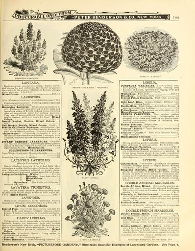 | Keywords: Everything for the garden (16666599988).jpg Rapid-Lowing constant-liloominpr tender peren- <br> nial plants for pot culture in the winter or garden <br> deeoration in the summer; clusters of flowers orange <br> white pink etc 2 to 3 feet <br> Mixed Colors Pit 10 <br> LARKSPURS <br> For Perennia 1 varieties see Delpbininm page 106 <br> Populargarden annuals Thelongspikes of splendid <br> flnwere are of varied colors <br> Branching' larkspnr ConsoHda Candelabra tl <br> pi This splendid class grows 2 to 3 feet high and <br> bears long spike-s of flowers on long stems rendering <br> them of exceptional value for cutting purposes <br> They are of long-continued bloom keeping up a <br> bright dieplav until cut down by fi'ost Mixed <br> Colors Pkt 10 <br> Dwarf Bocket Dotible Mixed Colors 1 <br> foot <br> Tall Socket Double Mixed Colors 2 ft 5 <br> Scarlet California Larkspnr Delphinium Car- <br> dinale Long spikes of brilliant scarlet flowers the <br> petal limbs distinctly yellow Height 3 to 4 feet lo <br> Snow-white ConsoHda Imperialis fl pi A <br> beautiful condelabra-formed dwarf Larkspur with <br> compact well-filled spikes of double pure white flow- <br> ers 10 <br> DWABF CHZETESE I ABKSPTTKS Delphin- <br> ium Chinese pumilum Exoet-dingly pretty garden <br> plants of branchy compait haliit not over a foot <br> high when in bloom Mixed Colors 10 <br> COZ I ECTZONS OF I ABKSPtTBS <br> Dwarf Rocket Larkspur 12 separate sorts -15 <br> 6 ˘ ˘ 2 - <br> Branching Larkspur 6 varieties 25 <br> LATHYRUS LATIFOLIUS <br> Hardy Everlasting Pea <br> Hardy climbers growing 6 to 8 feet high when <br> trained on a trellis the flowers are borne in large clus- <br> ters They are peculiarly adapted to rough places <br> to scrambieoverrocksanil bushes; splendid cut flower <br> Ziathyms Ziatifolitis White Pkt 10 <br> Delicata Rosy flesh color lO <br> Mixed Colors 5 <br> Bed 5 <br> Splendens The Pride of California <br> Brilliant rosy red 10 <br> LAVATERA TRIMESTRIS <br> Tall robust bushy annuals producing freely large <br> showy saucer-shaped single flowers of rose white etc <br> 3 feet Mixed Colors Pkt 5 <br> LAVENDER <br> Well-known ornamental hardy perennial bearing <br> long spikes of fragrant blue flowers 1 to 2 feet Pkt 5 <br> LINUM COCCINEUM <br> Scarlet Flax One of the most showy annuals for <br> flower beds and masses; brilliant crimson-scarlet <br> flowers 1 inch across borne in wonderful profusion <br> 1 foot Pkt 5 <br> HARDY LOBELIAS <br> Tall-growing hardy perennials with long spikes of <br> brilliant flowers; for permanent beds and borders <br> they are unrivaled; the v are one of the few flowering <br> plants that thrive in shady situations 2 to 4 feet <br> The mo st brilliant plants in cultivation Mixed <br> Colors Pkt 10 <br> Cardinalis Cardinal Flower Long spikes of <br> intense scarlet flowers 10 <br> Bivoirei Giant-flowering pink 2 j <br> Purst Bismarck Giant-flowering crimson 25 <br> FBENCH GILT EDGE MARIGOLD <br> AFRICAN MARIGOLD <br> LOBELIA <br> COMPACTA VABIETIBS Little round com- <br> pact plants 4 to 6 inches high forming little <br> mounds of bloom splendid for edging beds and <br> ribbon-gardening and fine for pots <br> White Gem Pure white Pkt 10 <br> Blue Xing' Dark blue white centre 10 <br> Crystal Palace Compacta Dark blue ; a popular <br> l e i ler 10 <br> Gold Iieaf Blue Golden foliage brilliant blue <br> flowers of striking beaut v 10 <br> Double Blue Dark foliage double blue flowers; of <br> superior stahillt v for bedding 10 <br> Prima Donna Ri'h-maroon red with white eye 10 <br> Mixed Compacta Varieties 10 <br> BBIITUS VABIETIES They produce trailing <br> branches to inclies long Indispensable for <br> hanging over vases and baskets or garden beds <br> bearing continuously flowers of charming blue <br> white or rose shades <br> Brinus Speciosa Bright blue 5 <br> Gracilis Light blue 5 <br> Tricolor Parrot Dark blue with carmine spots <br> an l wliite eyes 10 <br> Tricolor Colibri Pink with carmine blotch; <br> large white eye 10 <br> Mixed Erinus Varieties 5 <br> LUPINUS <br> strong-growing garden annuals with innumerable <br> spikes of flowers of various colors IVi to 3 feet <br> Mixed Annual Varieties Pi 5 <br> Arboreus Sno'W Queen This hardy perennial vari- <br> et v will ije found a great acquisition to gardens It <br> forms dense Ijushes about 4 feet high completely <br> 'lothed to the ground with elegant racemes of snowy- <br> white flowers 20 <br> LYCHNIS <br> Chalcedonica The scarlet Lychnis an old garden <br> favorite bearing heads of bright scarlet flowers; <br> very hardy H to 4 feet Pit 5 <br> Haageana Hybrids Mixed Colors Usually <br> grown as annuals; of dwarf bushy habit bearing <br> flowers an inch or more across in continuous suc- <br> cession until frost; the colors are particularly pleas- <br> ing ” from white to rich scarlet and shades of pink <br> 1 foot 10 <br> DOUBLE AFRICAN MARIGOLDS <br> Double African Mixed Old favorite garden an- <br> nuals but greatly inijiroved in size and doubleness <br> Effective f ir groujis and masses Yellow and orange <br> shades 2 feet Pkt 5 <br> Eldorado or Dahlia-flowered Immense flowers <br> 10 to 14 inches around; exceedingl v double; quilled <br> like a Dahlia; primrose lemon orange and golden <br> shades 3 feet 5 <br> Pride of the Garden Seepage 90 lo <br> Collection of Double African Marigolds 6 separate <br> colors 35c <br> DOUBLE FRENCH MARIGOLDS <br> Double French Mixed Yellow brown and crlin- <br> snn beautifully strijied 1 foot Pkt 5 <br> Gilt Ed e i 'f roluist growth and large and more <br> perfectly loul le flowers measuring from 3 to 4 <br> inches across color velvet v maroon edged with <br> vellow 10 <br> Double Xiilliput Mixed Colors r ittle plants <br> only 4 to 5 inches'high covered with small very <br> double flowers of bright yellow orange or garnet <br> edged golden Finefor edgings ma sses or tor pots 10 <br> \ llection of Double French Marigolds 6 separate <br> colors 25c <br> For Si