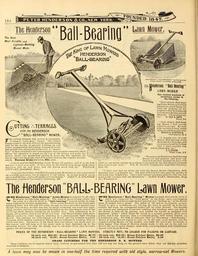Keywords: Everything for the garden (16666932480).jpg 184 <br> ˘PETER HENDERSON 6tC0 NEW YORK <br> TUG Henderson <br> The Best <br> Most Durable and <br> Lightest- Working <br> Mower Made <br> Ball-Bearino <br> f f <br> Lawn Mower <br> ' HENDERSON ˘ <br> 'BALLtBEARINC <br> / HENDERSON V <br> UTTING MERRflGES <br> with the tiENDERSON <br> BALL- BEARING MOWER <br> jCOR cutting terraces this mower is uneqnaled <br> Jf it being a train gear mower Tlie cutters <br> remain close to the sod withoutthe maclilne being <br> held by the handle to prevent bobbing up and <br> down; consequently for cutting terraces it works <br> just as well when the handle is removed A terrace <br> Iron Is then attached to the roller hangers then a rope Is connected which \ <br> allows the operator to stand on tlie top of the terrace and guide the <br> mower as its own momentum carries It down the hill operates tlie <br> knives and cuts the grass when it is pulled back by the rope for another <br> swath Terrace Irons are extra 60c each <br> 7 hn re used the Bn U-Bearing Ln wn Mower all namtiier and it is the best <br> machine I have ever used It lay s close to the turf ia long gra ss while other <br> machines hub up and down and the knives never clog up WILLIAM <br> STEWART SpringSeld Mass <br> I am convinced that your Ball-Bearing Lawn Mowerisnot only constructed <br> on scientiHc principles but is superior to all others In actual work it saves <br> about half tbetiwe and workseasily and charmingly JOHN V N STAXDISH <br> President Lombard University Galesburg Ills <br> ii <br> I AWN MOWER <br> li-IUJl VTTACUED <br> eqiierson Ball-Bearing <br> LflWN MOWER <br> Has received hundreds of <br> encomiums similar lo <br> the following <br> Tour 21-inch Ball-Bear- <br> ingLawn Mowermorethan <br> pleases me and ithasso ex- <br> cited the Jealousy of my <br> neighbor that he wishes me <br> to orderone for him exactlj <br> like mine Pleaseshipitby <br> etc Dr CHAS R SMITH <br> Tioga Pa <br> Your 24-inch Ball-Bear- <br> ing Mower I find exactly <br> suited to my use My man <br> tells me that it runs easier <br> t Imn our old 16-inch mower <br> HORATIO R NIGHTINGALE <br> I'ROVIDENCE R L <br> I bought two of your <br> 24-inch Biill-Ilearing Lawn <br> Mowersa fewdays ago and <br> we areso pleased with them <br> that I want another one <br> which please ship etc <br> E R DURKEE <br> West Pabk N Y <br> We used your Henderson Bail-Bearing <br> Mower all last summer and must say <br> ' that it is the best machine we have ever <br> tried iin our lawns and we have about every make in use but the men all agree <br> that yours is the ' boss ' W M H FL iTT Comptroller Lake Side Cemetery <br> Erie Fa <br> I have just bad my lawns cut with the 24-incb Mower Henderson Bail- <br> Bearing that you shipped me The ease with which it runs and the quality of <br> the work done delights me I have bad several machines prior to this one but <br> none could compare with the Henderson JAMES H iRT Christopher King <br> Co Washington <br> The Henderson BflLL-BEflRiNG Lawn Mower <br> / 'HE Henderson Ball-Bearinff ' <br> L\ Mowers in the following respects <br> ' I awn Mo'wer is superior to all other <br> The axles of tlie revolving cutter like <br> the axles of a bicycle work in ball-bearing journal boxes or cups <br> which reduces the friction enormously These parts are made of the finest case- <br> hardened steel and will last for years though we have provided against wear <br> should there be any ” so that anyone by simply loosening one screw and tight- <br> ening another can force the cup and balls higher up the cone-shaped ends of the <br> revolving shaft thereby taking up ail possible wear This adjustment is so <br> simple yet positive that it can be set to a hair Our Mower is also built scien- <br> tificall v correct in other respects resulting in a phenomenally light running <br> Mower The castings are lathe-turned and bored and the journals machine- <br> trimmed which insures trueness in fitting and smoothness in working with no <br> rattle and play The knives of the finest steel and temper are sharp and cut <br> like razors and will keep so it the under knife is kept tiglitened up to the <br> revolving knives; for then the blades wear to the same bevel and in conse- <br> quence are self-sharpening <br> PRICES OF THE HENDERSON BALL BEARING LAWN MOWERS <br> 16-incli cut 10 00 ; Grass Catcher Extra 1 75 <br> 18-incb cut 11 00 ; Grass Catcber Extra 1 85 <br> / HE Henderson Ball-Bearing Mower has high drivewheels both of <br> 1\ which are connected by train gears to the large open non-clogging <br> cylindiT placed farenough back to prevent any kicking up of the Mower <br> when it strikes heavy grass The spiral of the knives is correctly propor- <br> tioned to give a continuous cut leaving the lawn as smooth as if shaved <br> entirely free from the corrugated surface left by other Mowers The handles <br> are braced and reinforced to prevent twisting and breaking when one side of <br> the Mower Is held off the ground and besides the handle is equipped with <br> improved grips which keeps the hands in a natural position gives more <br> power and is less tiresome than a continued grasp with wrists twisted on <br> a horizontal grip We wish to reiterate that our Henderson Bail-Bearing <br> Mower is made without regard to cost ” to be the best most durable and the <br> easiest-working Mower on the market and while the prices are necessarily a <br> little higher than those of Mowers simply made to sell yet in tlie end our <br> Mower will prove much cheaper aside from annoying delays and repairs expe- <br> rienced with cheap Mowers <br> STRICTLY NET; NO CHARGE FOR PACKING OR CARTAGE <br> 21-incIi cut 12 50; Grass Catcher Extra 2 00 <br> 24-inch cut 14 00 ; Grass Catcher Extra 2 50 <br> GBASS CATCHEBS FOS THE HEKDEBSOK B B UOWEBS <br> These Catchers are of superior heavy duck; bottom of galvanized iron that will not sag nor drag on the ground when filled