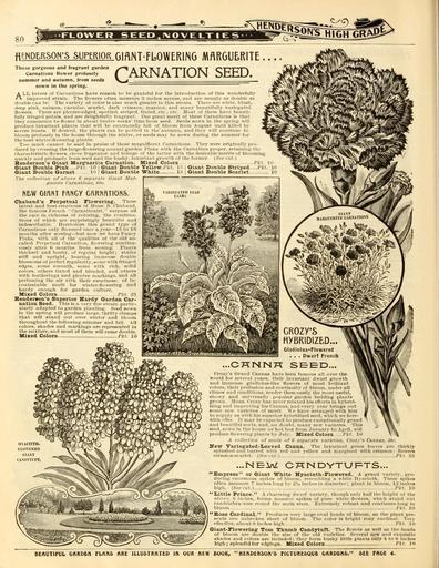 | Keywords: Everything for the garden (16828274336).jpg 80 <br> I <br> FLOWER SEED <br> f FNDERSON-S SUPERIOR niflNT-FUnWFRINri MflRGUERITE <br> f ARNATION SEED <br> These gorgeous and fragrant garden <br> Carnations flower profusely <br> summer and autumn from seeds <br> sown in the spring <br> ALL lovers ot Cai-nations have reason to be grateful for the introduction of this wonderfully <br> improved strain The flowers often measure 3 inches across and are usually as double as <br> double can be The variety of color Is also much greater in this strain There are wliite blush <br> deep pink salmon carmiiie scarlet dark crimson maroon and nian v beautltuil v variegated <br> flowers There are picotee-edged spotted striped tinted etc etc Most of them have beauti- <br> fully fringed petals and are delightfull v fragrant One great merit of these Carnations is that <br> they commence to flower in about twelve weeks' time from seed Seeds sown in the spring will <br> produce luxuriant plants that will be continually full of bloom from August until killed by <br> severe frosts If desired the plants can be potted in the'autumn and they will continue to <br> bloom profusely in the house through the winter or seeds may be sown during the summer for <br> the best winter-flowering plants <br> Too much cannot be said in praise of tliese magnificent Carnations They were originally pro- <br> duced by crossing the large-flowering annual garden Pinks with the Carnation proper retaining the <br> characteristic flowers ilove fragrance and foliage of the latter with the desirable merits of blooming <br> quickly and ijrofusely from seed and the bushy luxuriant growth of the former See cut <br> Henderson's Giant Margoierite Carnation Mixed Colors Pkt lo <br> Giant Doitble Pink Pkt 10 I Giant Double Yellow / A- f ir Giant Double Striped Pkt 10 <br> Giant Double Garnet 10 Giant Double White 1 Giant Double Scarlet 10 <br> The collection of nhore 6 separate Giant Mar- <br> sxucnte Carnations 00c <br> NEW GlftNT FflNGY GftRNftTiONS <br> Chaband's Perpetual Plowerinff These <br> latest and best creations of Jlons B Chabaud <br> the famous French Caruationist surpass all <br> the race in richness of coloring the c' mbin;i- <br> tions of which are surprisingly beautiful and <br> indescribable Heretofore this grand type of <br> Carnations only flowered once a year ” 15 to 18 <br> months after sowing ” but now we have Fancy <br> Pinks wntli all of the qualities of tlie old so- <br> called Perpetual Carnation flowering continu- <br> ously after J months from sowing Plants <br> thickset and bushy of regulai; height; stalks <br> stiff and upright bearing immense double <br> blossoms of perfect regularity somewith triugi'd <br> edges some smooth some with rich sulid <br> colors others tinted and blended and others <br> with featherings and picotee markings and all <br> perfuming the air with their sweetness; of in- <br> contestable merit for winter-flowering and <br> hardy enough for garden culture <br> Dlized Colors Pkt 2 5 <br> Henderson's Superior Hardy Garden Car- <br> nation Seed This is a very fine strain partic- <br> ularly adapted to garden planting Seed sown <br> In the spring will produce large thrifty clumps <br> that will stand out over winter and idoom <br> throughout the following summer and fall All <br> colors shades and markings are represented in <br> the mixture and most of them will come double <br> Mixed Colors Pkt lo <br> GROZY'S <br> HYBRIDIZED <br> Gladiolus-Flowered <br> Dwarf Prench <br> CHNNH <br> Crozy's Grand C'annas have been famous all over the <br> world for several years their luxuriant dwari growth <br> and immense gladiolus-like flowers of most brilliant <br> colors their profusion and continuity of bloom under all <br> climes and conditions render them easily the most useful <br> slidwy and universally popular garden bedding plants <br> gniwn Mons Crozy has never relaxed his efforts in hytirld- <br> iziiigand improving his Cannas and every year brings out <br> siiiiie new varieties of merit We have arranged with him <br> to siipiily us with his superior hybridized seed which we here- <br> with offer It may be expected to roduce exceptionally grand <br> and beautiful sorts and no doubt many new varieties This <br> seed sown in the house or hot bed from Tanuar v to April will <br> produce flowering plants by July Mixed Colors Pkt 10 <br> A collection of seeds of G sejiarate varieties Crozj'fi Cannas SOc <br> New Varie ated-Iieaved Canna The luxuriant green leaves are thickly <br> splashed and barred with red and yellow and margined with crimson flowers <br> crimson-scarlet See cut Pkt 25 <br> NE1a£ C7 NDVTUI TS <br> Empress or Giant White Hyacinth-Plowered A grand variety pro- <br> ducing enormous spikes of bloom resembling a white H vacinth Tlie se spikes <br> often measure 7 inches loug bv tiVi inches in diameter; plant in bloom 12 inches <br> high See cut ' Pkt 10 <br> Iiittle Prince A charming dwni-f variety though only half the height of the <br> aliove j Indies forms massive sjjikes of pure white flowers which stand out <br> candelabra-wise round the main stem E xtremely robust and continues long in <br> blc <br> If 10 <br> Rose Cardinal Produces very large oval heads of bloom so the plant pre- <br> sents one unbroken sheet of bloom The color is bright rosy cardinal Very <br> effective about S Inches liigli Pkt lb <br> Giant-Flowering' Tom Thumb Candytuft The florets as well as the heads <br> of bloom are double the size of the old varieties Several new and exquisite <br> shades and colors are included ; they form bushy little plants only 4 to 6 inches <br> high ; splendid for edgings Mixed Colors Pkt 10 <br> BEflUTlfUL GflRDEK FLANS ARE ILLUSTRATED IK OUR hEW SOOK HENDERSON'S FICTURESQUE GARDENS SEE PAGE 4 42383169 133997 66553 Page 80 Text http //www biodiversitylibrary org/page/42383169 1902 10 5962/bhl title 66553 Henry G Gilbert Nursery and Seed Trade Catalog Collection ; Pete
