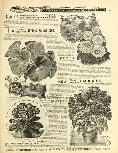 | Keywords: Everything for the garden (16828292486).jpg  ˘PETER HENDERSO N fl; CO IMEW YORK <br> 89 <br> Beaatifal crirctTo' Tn g GODETIAS <br> Of all earden annuals few are as beautiful as Godetias being exceedingly showy <br> when grown in beds and masses; these new varieties are very compact and bushy <br> In habit forming oval plants about 1 foot high completely enveloped with large <br> Eorsreouslv colored flowers from 2 to 3 inches across <br> Rosamond Large flowers of an exquisite shade of glossy light plnk a mre <br> Sunset Large iaowers of glowing deep rosy carmine dazzlingly effective 20 <br> Ilem <br> Giant- <br> flotuering <br> Hybrid GeFaniams <br> A strain of seed saved from grand new Hybrids all greatly enlarged and im- <br> DFOved The flowers are extra large round of the most perie t forms borne on <br> splendid trusses some of them forming balls 16 inches in circumference The i rs <br> are all shades of scarlet and crimson rose pink salmon cream veined pink blush <br> snowv white and all of the new auricle types with lovely rings and large white eyes <br> these all stand the M <br> sun Although perm <br> nials they will produce i <br> bushy plants and flower <br> seeds sown the same si i <br> gorgeous flowers of mo <br> borne continuousU ren <br> ular plants for pot cultuic in wintei or toi <br> bidding out in summer <br> 1 J to 18 ini lies hi ;h s <br> cnt /'A' 1 <br> Doiarf Japanese <br> HOIiliYHOCKS <br> Pyramidal little plants <br> only 15 to 18 inches high <br> jiroducing large semidouble <br> llowers frombaseto summit <br> These very unique and beautiful <br> Hollyhocks from the Flowery <br> kini vdom are great acquisitions The plants grf <br> Kingdom are fercrt ' covered from bottom to top with semi <br> row in pyramidal form to a <br> i'oTI -We h ve'jusrrec of these mtle Hollyhocks from Japan <br> NEW «°iT rn3 Giioxmifls <br> ost charming greenhouse plants of dwarf habit Their flowers are produced <br> ton and of thi most exquisite and gorgeous colors many of which are mag- <br> ' e <br> GIANT B\BRID <br> GERANIUM <br> Gloxinias are m <br> i fi nHrspStted mottl 5 and'blended Un ier the <br> commonest culture they bloom continuously for <br> months This new giant strain produces <br> flowers of extraordinarily large_ dimen- <br> sions measuring from 4V2 to o inches <br> across The colors are rich varied and <br> strikingly beautiful 1 foot See cut <br> Giant lAixed Colors P - <br> Gloxinia Largre Flowering <br> Choice Mixed Colors /'At 2 <br> oiant- jiEiiioTt OPES <br> flotueping <br> Those who have not seen these mag- <br> Diflcent Heliotropes can have no con- <br> ception of the great advance made <br> in improving this old favorite <br> The heads of blossoms of this <br> new sort often measure a foot <br> across the individual ilorets <br> are also very large and their <br> delicious perfume is just as <br> enchanting as in the old small- <br> flowering types The plants <br> of the new sorts are also <br> more healthy bushy and <br> compact the leaves arelarge <br> and luxuriant; seed sown in <br> the spring produces full- <br> grown profuse flowering <br> plants by Inly which flower <br> in the garden until cut down <br> by frost or if grown in pots <br> for winter flowers they are of <br> unsurpassed beauty See cat <br> Iiemoine's Giant Hytorid He- <br> liotrope 18 inches high Colors <br> jiuiple blue lavender white etc <br> mixtures Pkt 10 <br> Giffantenm Nantim Plants very <br> dwarf and compact only 8 to 10 inches <br> high with enormous umbels of flowers <br> Mixed Colors Pkt 20 <br> T flNTflNfl DWRHF GOlflPflGT HYBHIDS e J w y Tt Jre rs r JIr ti e <br> U colors more varied andshowy and Ijeingof bushy compact habit ” only 8 to 1 inches higli <br> ”being of great value for bedding as well as pot cultui-e Mixed Colors t kt _o <br> rTe q remember you are entitled to sE E cUroF PREMIUMS BpSTa I 5 42383178 133997 66553 Page 89 Text http //www biodiversitylibrary org/page/42383178 1902 10 5962/bhl title 66553 Henry G Gilbert Nursery and Seed Trade Catalog Collection ; Peter Henderson Co NameFound Gloxinia NameConfirmed Gloxinia L'Her EOLID 72184 Biodiversity Heritage Library Everything for the garden 1901 Garden Stories Catalogs Flowers Peter Henderson Co Plants Ornamental Seed industry and trade Seeds Trade catalogs U S Department of Agriculture National Agricultural Library bhl page 42383178 dc identifier http //biodiversitylibrary org/page/42383178 bhlGardenStories Hollyhocks Geraniums Gloxinia Heliotropes BHLinbloom peter henderson co plants ornamental u s department of agriculture national agricultural library bhlgardenstories bhlinbloom Information field Flickr posted date ISOdate 2015-03-18 Check categories 2015 August 24 CC-BY-2 0 BioDivLibrary https //flickr com/photos/61021753 N02/16828292486 2015-08-24 20 54 15 cc-by-2 0 PD-old-70-1923 Gloxinia Everything for the garden 1902 Photos uploaded from Flickr by Fæ using a script |
