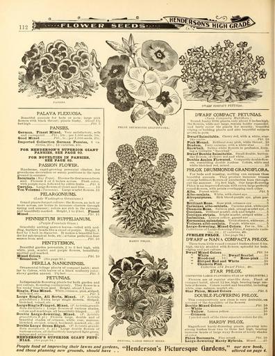 | Keywords: Everything for the garden (16828334916).jpg PALAVA FLEXUOSA <br> Beautiful nntnials for beds or pots; lar u;e pink <br> flowers with black throat ; plants bushy About IV2 <br> feet high ' Pkt 5 <br> PANSIES <br> German Finest Mixed Very satisfactory selfs <br> and viiriPKated I'kr 10c ; er 000 seeils r Oc <br> Good Mixed l'kt 5f ; per 1 000 seeds 2 jr <br> Imported Collection German Fansies G va- <br> rieties 2 c Ill vjirieties 40c <br> FOB HENDEBSOIT'S SUFEBIOB GIAITT <br> PANSIES SEE PAGE 93 <br> FOB NOVELTIES IN PANSIES <br> SEE PAGE 82 <br> PASSION FLOWER <br> Handsome rapid-growiupr perennial climber for <br> greenhouse decoration or sunny positions in the open <br> ground in summer <br> Incarnata May I'ops Blooms the firstseason from <br> seed Flowers 2 or 3 inches across Flesh color <br> with purple rays followed by edible fruits Pkt T <br> Ccemlea Larneflowersof violet and blue 10 <br> Von Volexmi Tacsonia Larjje scarlet flowers 5 <br> PELARGONIUMS <br> Lady H' i s/jifiA diT tniunif <br> Grand plants forpot culture the flowers an inch or <br> more across are borne in immense clusters throui h <br> spring and summer; colors are rich in the extreme <br> and beautifull vmarked Height 1 to 2 feet Finest <br> Mixed Pkt l l <br> PENNISETUM RUPPELL\NUM <br> Purple Fountain Gras t <br> Gracefully arching narrow leaves ” veiled with nod- <br> ding feathery heads like a cloud of purple Height 1 <br> foot by 1 foot in diameter It makes a beautiful bor- <br> der for 8Ub-troi lcal beds etc ; attains perfection first <br> season from seed Pkt 10 <br> PENTSTEMON <br> Beautiful garden perennials 2 to 3 feet high with <br> white pink scarlet and purple flowers beautifully <br> spotted and marked <br> Mixed Colors Pkt 10 <br> Sensation See page 9 i <br> PERILLA NANKINENSIS <br> Ornamental foliage plants of comjiact habit; simi- <br> lar to Coleus with leaves of a black mulberry color ; <br> showy garden annual IV-i feet Pkt ~ <br> PETUNL\S <br> Indispensable flowering plants for both garden and <br> pot culture flowering continuously They lower in a <br> few weeks' time from seed Height about 1 toot <br> Sing'le Fine Mixed White crimson pink striped <br> blotched etc Pkt 5 <br> large Single All Sorts Mixed P bybrida <br> firanrlitiora Extra large single flowers Striped <br> blotched veined etc 10 <br> LargeSingleFringed Mixed P hyhridagrandi- <br> tlom limbrinta Large flowers of various shades <br> colors and markings all beautifull v fringed 25 <br> Donble Iiarge-flowering Mixed P bybrid i <br> grandWora fl pi Flowers large double and of <br> beautiful shades of crimson white rose maroon; <br> blotched striped veined bordered marked etc 20 <br> Bonble Iiarge Green Edged P hvbridn grandi- <br> ilora mar giiiata II pi Large double flowers of <br> varioiLs colors all distinctively nuirgincd light green <br> uiii \ie and attractive 3 <br> HENDEBSON'S STTFEBIOB GIANT PETU- <br> NIAS Sri' iiageHi <br> PHLOX DKl'M-MO-NUI GBANDIFLORA <br> H lItll ˘ I'liLox <br> DWARF COMPACT PETUNIAS <br> V iii - Ci nip;i ta \rnllilliir i <br> Uound bushv little plants only about H inches high; <br> tile tlowers while not large remain boldly expanded <br> and fairly cover the plants for months beautiful <br> I'dging or bedding plants and also beautiful subjects <br> grown in pots <br> Dwarf Inimitable Cherrv red with a white Btar- <br> liki' c-ijtri- Pkt 10 <br> Pink Mound Brilliant rosy jiink white throat 10 <br> Diadem Fiery c irndne with a white star 10 <br> Snowball Satinv-white flowers in profusion form- <br> irjga vr-ritalilc ˘ ˘Snowball 10 <br> Dwarf Double Inimitable Small double button- <br> like llowiTs of chi'rry red and white 20 <br> Double Azalea Flowered Compactly doubleflow- <br> ers resembling double Azaleas Colors white and <br> white blotched ri d mixed 15 <br> PHLOX DRUMMONOn GRANDIFLORA <br> For beds and massing nothing can Kurjjnss these <br> lienutiful annuals Tlie v produce Immense trusses <br> of large brilliant flowera of numberless hues through- <br> out the summer I'i feet high Our large-flowering <br> I'hiox is an improved strain with extra large perfectly <br> round flowers with petals overlapping each other <br> Alba Purest white Pkt 5 <br> Albo-ocnlata White with claret eye 5 <br> Atropurptirea Rich blood-purple eye plum pur- <br> ple <br> PETU NIA LAIiGE SINGLE MIXED <br> Brilliant Bose Rose pink crimson eve 5 <br> Camiinea albo-oculata Carndne-plnk whiteeyeS <br> Chamois Bose Salmon pink orange-scarlet eye 5 <br> Coccinea Urillinnt scarlet rich and bright 5 <br> Coccinea striata Bright scarlet striped white 5 <br> Isabelliua I 'mon yellow garnet e ve 5 <br> Kermesina splendens Vivid crimson whiteeye 5 <br> Violacea albo-oculata Piuple white e ve 5 <br> Large-flowering Mixed Colors Per oz 50c 5 <br> 'i Ufitiijns iirLargi'-IIiiucritig Phlox H separate rarie- <br> f IC S- ' 7c ; IJ y irii-ties 40c <br> JTTBIZJ3 FBXOX See -ige 94 <br> DWARF or NANA COMPACTA PHLOX <br> These form little r iund compact bushes about r Ins <br> high thickly studded with flowers; splendid for beds <br> edging and pot culture <br> Dwarf Mixed Colors Pkt 10 <br> White 10 I Dwarf Scarlet 10 <br> Blood-red 10 Bose-pink 10 <br> Striped Bed and White 10 <br> Chamois Pink 10 <br> Collvitinn of II Dwarf Phlox 40c <br> STAR PHLOX <br> IMPnOVED T ARGE-FLOWf;niNG STAR OF QFEDLINBUBO <br> Flowers are of regiil ir star-like form Plant of <br> compact habit about 12 ins high bearing large um- <br> bels of flowers Colors varied and beautiful including <br> vhite rose salmcm scarlet etc <br> Star Phlox Mixed Colors Pkt 5 <br> DOUBLE-FLOWERING PHLOX <br> This comparatively new class is very desirable on <br> ai'connt of th wlnraliility of the flowers <br> Double Mixed Colors Pkt 10 <br> White 10 <br> Yellow Lemon yellow 10 <br> Crimson 10 <br> 1 packet each of the three separate colors for 35c <br> HARDY PHLOX <br> Magnificent hnrd v-flowering plants growing into <br> strong bushes from two I0 three feet high bear