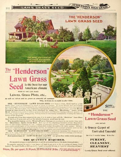 | Keywords: Everything for the garden (16853182432).jpg 192 <br> THE'HENDERSON <br> LAWN GRASS SEED <br> The <br> Lawn Grass <br> Seed <br> is the best for our <br> American climate <br> WITH IT YOU CAN MAKE <br> Lawns Grass Plots etc <br> as soft as velvet and as green as emerald all summer <br> long in from six to eight weeks' time <br> THE HENDERSON LAWN GRASS SEED will form a close thick turf in a few <br> – weeks' tiriK' with no idideucy to stool or grow in cliuups Ii roots dfPiil3' and wiilistaiids <br> severe droughts without turning brown maintaining its beautiful deep green color tlir oui/hout <br> the season We have mad – the tormatio i of permanent lawns a study for year~ a; - the Finest <br> Lawns in this country to-day were obtained by using the ˘Henderson ' Law ii Grass <br> Seed which is composed of various grasses that grow and flourish during ddferent nioni li n <br> the year so that a rich deep green velvety lawn is constantly maintained rivaling the fanums <br> lawns of Old England <br> If people only knew how comparatiifely easy if is to make a lawn with the Henderson Lawn Grass <br> Seed the djys of using sod with all the attendant expense would soon be over <br> The beautiful lawns at t' ia World's Fair in Chicago we produced in six weeks' time with <br> the 'Henderson Lawn Grass Seed Not one of tlv charming features of the Ex iosition <br> was ' o universally admired as our setting of emerald velvet which notwithstanding the <br> long-continued drought of the summer retained iV s verdure throurjhoui Ike entire seasoi-- Besides <br> being the only lawn grass seed gr uitej a medal we exliibited the snpurate grasses used in the <br> mixture and received Seven Aw ards fi r siipeiinr quality and urily of samples <br> THE – HENDERSON LA-WN GRASS SEED is relatively speaking the cheapest seed <br> offeied biT iuse while the lawn grass mixtures oi other seedsmen will not average over 14 lbs <br> to the bushel this weighs from 20 to 21 iis pei- iUasured bushel <br> Full instructions of HOW TO M A KB A LAWN are given free with every package <br> THE QUANTITY REQITIreD <br> We furnish it in large or small quantities to suit the pretentious lawn or the modest dooryard plot <br> The quantity required for mahn i new lawns is 5 bushels per arre nr for reiovatmg old lawns 1 to 2 <br> bushels For a plot 15x20 or 300 squjre ft I quart /s re juired for new or I pint for renovating old lawns <br> Prices 25c per quart L50 peck 5 00 bushel of 20 lbs VcfpTr quart for pIs l O <br> THE <br> Henderson <br> Lawn Grass Seed <br> AND OBTAIN <br> A Grassy Carpet of <br> Unrivaled Emerald <br> in 6 to 8 weeks' time It is the <br> PUREST <br> CLEANEST <br> HEAVIEST <br> Lawn Grass Seed ever offered 42383281 133997 66553 Page 192 Text http //www biodiversitylibrary org/page/42383281 1902 10 5962/bhl title 66553 Henry G Gilbert Nursery and Seed Trade Catalog Collection ; Peter Henderson Co Biodiversity Heritage Library Everything for the garden 1901 Garden Stories Catalogs Flowers Peter Henderson Co Plants Ornamental Seed industry and trade Seeds Trade catalogs Vegetables U S Department of Agriculture National Agricultural Library bhl page 42383281 dc identifier http //biodiversitylibrary org/page/42383281 bhlGardenStories Lawn Grass BHLinbloom peter henderson co plants ornamental u s department of agriculture national agricultural library bhlgardenstories lawn grass bhlinbloom Information field Flickr posted date ISOdate 2015-03-18 Check categories 2015 August 24 CC-BY-2 0 BioDivLibrary https //flickr com/photos/61021753 N02/16853182432 2015-08-24 19 58 45 cc-by-2 0 PD-old-70-1923 Everything for the garden 1902 Photos uploaded from Flickr by Fæ using a script |