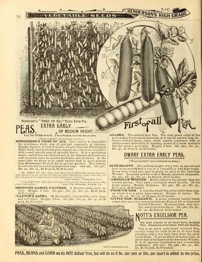 Keywords: Everything for the garden (Page 56) (16646122412).jpg tienclerson's <br> PEflS <br> EXTRA EARLY <br> OFMtDlUM HEIGHT <br> I qt for 75 feet of drill 2 to 3 bushels in drills tor an acre <br> Tliosp wnrkfri are n-rinklpri varieties <br> HENDERSON'S FIRST OP ALL This variety is unequalled <br> for excellence yield size of pod and regularity of ripening <br> Height 21 feet or fully 6 inches dwarfer than the Philadelphia <br> Extra Early and produces pods of good size whiuhare well filled <br> with round smooth peas of splendid flavor It is a prodigious <br> bearer and in this last feature and in its extreme earliness con- <br> sists its great value to market gardeners and truckers At the <br> same time we know of no other variety that is more popular <br> than Henderson's First of All in private gardens This variety <br> is sent out only in sealed packages and bags See cut 10c pkt <br> 20c pt 30c qt 1 25 peck 4 00 bushel <br> My FIRST OF ALL Peas »ere from ten to fifteen rja v i earlier than an v <br> other farmer's in my section wlio did not plant Henderson's peas; and they are <br> the best peas 1 ever planted and I have tried many varieties <br> JoH s' SiMKiNS Wilmington N C <br> Your FIlfST OF ALL Peas beat any I ever saw in the pea line of over fifty <br> years' cultivation John Wm Hdbbard Norfolk Va <br> IMPROVED DANIEL O'ROURKE A favorite extra early va- <br> riety Height 3 feet 10c pkt 15c pt 25c qt 1 20 peck <br> 3 75 bushel <br> ™¦LAXTON'S ALPHA Of fine qualitv very prolific ; pods large <br> and well filled Height 3 feet 10c jpkt iSc pt 25c qt 1 25 <br> peck -1 25 bushel <br> ALASKA The earliest blue Pea The dark green color of the <br> pods makes it extremely desii'able as it can be carried loDg dis- <br> tances without losing color which quality combined with its <br> earliness and uniformity of ripening makes it a most desirable <br> Pea for market gardeners Height 2 feet 10c pkt 15c pt <br> 25c qt 1 40 peek SI 50 bushel <br> DWARF EXTRA EARLY FEflS <br> I Thot e marked are wrinkled varieties <br> BLUE BEAUTY Of a uniform height of 1 feet so smooth and <br> level in its growth that a row of it resembles a well-kept hedge <br> It is a blue round pea and is nearly as early as the Americaa <br> Wonder In qualitv and flavor Blue Beauty cannot be surpassed <br> lOe pkt 15e pt 25c qt SI 20 peck 3 75 bushel <br> ™¦AMERICAN WONDER Bettor suited to the private than the <br> market garden Very early ; extremely dwarf growth Of the <br> finest quality Height 12 inches 10c pkt 20c pt 30c qt <br> 1 75 peek 8 00 bushel <br> PREMIUM GEM A very fine dwarf Pea of the Little Gem type <br> on which it is a great improvement Height 15 inches 10c <br> pkt 15e pt 25e qt Sl fiO peck S5 50 bushel <br> LITTLE GEM McLEAN'S A green wrinkled variety which <br> comes into use a few days later than the First of All or Improved <br> __ Daniel O'Kourke 18 inches high very pro- <br> ' lific and of excellent flavor 10c pkt 15c pt <br> ” 25c qt 1 60 peck 5 50 bushel <br> NOTT 8 EXCELSIOB PEA <br> OTT'S EXCELSIOR PEA <br> The most valuable of all Dwarf Early Wrinkled <br> Peas Surpassing in Earliness Yield and Quality <br> This is an extra early dwarf wrinkled Pea <br> usually ready for table in 40 to 45 days from <br> planting only a few daj's later than the early <br> round sorts It grows about 14 inches high or <br> about half as tall again as the American Wonder <br> It is of vigorous constitution and wonderfully <br> productive See cut 10c pkt 20c pt 30c <br> qt 1 75 peck 6 00 bushel <br> PEAS BEftNS and CORN we do NOT deliver tree but will do so it 5g per Dint or 10c per quart is added to the price 42383097 133997 66553 Page 56 Text http //www biodiversitylibrary org/page/42383097 1902 10 5962/bhl title 66553 Henry G Gilbert Nursery and Seed Trade Catalog Collection ; Peter Henderson Co Biodiversity Heritage Library Garden Stories Catalogs Flowers Peter Henderson Co Plants Ornamental Seed industry and trade Seeds Trade catalogs Vegetables U S Department of Agriculture National Agricultural Library bhl page 42383097 dc identifier http //biodiversitylibrary org/page/42383097 BHLinbloom peter henderson co plants ornamental u s department of agriculture national agricultural library bhlinbloom Information field Flickr posted date ISOdate 2015-02-25 PD-old-70-1923 Everything for the garden 1902 Photos uploaded from Flickr by Fæ using a script Files from the Biodiversity Heritage Library released as Attribution-NonCommercial-ShareAlike |