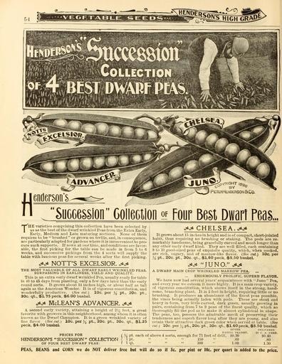 Keywords: Everything for the garden (Page 54) (16621200776).jpg 54 <br> iid rf fc i i iqH i i i -m- <br> mm- <br> '4 '\ - <br> 'mxfi- <br> H <br> ti <br> Succession GoiieGiion of Four Best Dwarf Peas <br> THE varieties comprising this collection liave been selected by <br> us as the best of the dwarf wrinliled Peas from the Extra Early <br> Earlj' Medium and Late maturing sections None of them <br> requires to be brushed or grown on trellis and in consequence <br> are particularly adapted for gardens where it is inconvenient to pro- <br> cure such supports If sown at one time and conditions are favor- <br> able the first picking for the table can be made in from 5 to 6 <br> weeks and successive pickings from the 4 sorts will supply the <br> table with luscious peas for several weeks after the first picking <br> J- NOTT S EXCELSIOR <br> THE MOST VALUABLE OF ALL DWARF EARLY WRINKLED PEAS <br> SURPASSING IN EARLINESS YIELD AND QUALITY <br> This is an extra early dwarf wrinkled Pea usually ready for table <br> in -10 to 45 days from planting only a few days later than the early <br> round sorts It grows about 14 inches high or about half as tall <br> again as the American Wonder It is of vigorous constitution and <br> wonderfully productive See cut 10c per i pt 20c pt <br> 30c qt 1 75 peck 6 00 bushel <br> e McLEAN S ADVANCER <br> A second early variety attaining a height of 2' feet a great <br> favorite with growers in this neighborhood among whom it is often <br> known as the Dwarf Champion It is a green wrinkled variety of <br> fine flavor See citi 10 c per 3 pt 20c pt 30c qt 1 25 <br> peck 4 00 busbeL <br> CHELSEA <br> It grows about l 'j inches in height and is of compact short-jointed <br> habit thus requiring no brushing or staking The pods are re- <br> markably handsome being gracefully curved and much longer than <br> any other early dwarf kind They are well filled each containing <br> 8 to 10 good-sized peas of exquisite quality which when cooked <br> are rich sugary and of marrow-like flavor See cwt 10c per <br> i pt 20c pt 30c qt 1 60 peck 5 50 bushel <br> A DWARF MAIN CROP WRINKLED MARROW PEA <br> ENORMOUSLY PROLIFIC SUPERB FLAVOR <br> We have now had several years' acquaintance with Juno Pea <br> and every year wo esteem it more highly It is a main crop variety <br> of vigorous constitution which shows itself in the strong hand- <br> some branching plant It is 2 feet in height requiring little or no <br> brushing It produces an abundance of the finest peas possible <br> the vines being actually laden with pods These are stout and <br> heavy in form very little curved dark green usually growing in <br> pairs containing from 7 to 9 peas of the finest quality which so <br> thoroughly fill the pod as to make it almost cylindrical in shape <br> The peas too possess the admirable merit of preserving their <br> tenderness and superb flavor long after they are 3'oung and also <br> retain their attractive dark green color when served at table Sec <br> cut 10c per 1 ; pt 20c pt 30c qt 1 60 peck 5 50 bushel <br> PRICES FOR y pt each of <br> HENDERSON'S SUCCESSION COLLECTION - i pt <br> OF FOUR BEST DWARF PEAS I 1 qt ' <br> DUVER DEMVERED <br> P \yiX ; TRANSIT IN u H EBEB <br> above 4 sorts enough for 75 feet of drill 0 30 0 40 <br> 150 60 80 <br> 300 1 00 1 30 <br> PEAS BEANS and CORN we do NOT deliver free but will do so if 5c per pint or lOc per quart is added to the price 42383095 133997 66553 Page 54 Text http //www biodiversitylibrary org/page/42383095 1902 10 5962/bhl title 66553 Henry G Gilbert Nursery and Seed Trade Catalog Collection ; Peter Henderson Co NameFound Medium NameConfirmed Medium NameBankID 4904049 NameFound None NameConfirmed None EOLID 2913255 Biodiversity Heritage Library Garden Stories Catalogs Flowers Peter Henderson Co Plants Ornamental Seed industry and trade Seeds Trade catalogs Vegetables U S Department of Agriculture National Agricultural Library bhl page 42383095 dc identifier http //biodiversitylibrary org/page/42383095 BHLinbloom peter henderson co plants ornamental u s department of agriculture national agricultural library bhlinbloom Information field Flickr posted date ISOdate 2015-02-25 PD-old-70-1923 Everything for the garden 1902 Photos uploaded from Flickr by FĂŚ using a script Files from the Biodiversity Heritage Library released as Attribution-NonCommercial-ShareAlike |