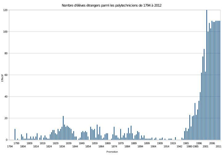 | Keywords: Évolution nombre étrangers Polytechnique.svg fr Évolution des effectifs d'élèves étrangers admis sur concours ou auditeurs libres parmi les élèves du cycle ingénieur polytechnicien de 1794 à 2012 2013-05-11 11 33 37 own A455bcd9 Sources Jacques Lesourne dir et Anousheh Karvar Les polytechniciens dans le siècle 1894-1994 1994 417-434 p ISBN 2-10-002338-1 « Les élèves étrangers Analyse d'une politique » Maurice Bernard « Le recrutement des élèves étrangers à l'École polytechnique par le concours dit de la catégorie particulière de 1944 à 1995 » La Jaune et la Rouge 559 novembre 2000 http //www lajauneetlarouge com/article/le-recrutement-des-eleves-etrangers-lecole-polytechnique-par-le-concours-dit-de-la-categorie « Annexe n° 1 Répartition géographique des élèves étrangers 1921-1985 » Bulletin de la Sabix En ligne 26 2000 mis en ligne le 26 avril 2010 consulté le 10 mai 2013 URL http //sabix revues org/286 http //www legifrance gouv fr/affichTexte do dateTexte categorieLien id cidTexte JORFTEXT000000362939 fastPos 151 fastReqId 1136063336 oldAction rechExpTexteJorf 1993 http //www legifrance gouv fr/affichTexte do dateTexte categorieLien id cidTexte JORFTEXT000000367229 fastPos 81 fastReqId 1136063336 oldAction rechExpTexteJorf 1994 http //www legifrance gouv fr/affichTexte do dateTexte categorieLien id cidTexte JORFTEXT000000371006 fastPos 24 fastReqId 1401890671 oldAction rechExpTexteJorf 1995 http //www legifrance gouv fr/affichTexte do dateTexte categorieLien id cidTexte JORFTEXT000000745890 fastPos 57 fastReqId 1136063336 oldAction rechExpTexteJorf 1996 http //www legifrance gouv fr/affichTexte do dateTexte categorieLien id cidTexte JORFTEXT000000387136 fastPos 51 fastReqId 1136063336 oldAction rechExpTexteJorf 1997 http //www legifrance gouv fr/affichTexte do dateTexte categorieLien id cidTexte JORFTEXT000000757944 fastPos 16 fastReqId 709425633 oldAction rechExpTexteJorf 1998 http //www legifrance gouv fr/affichTexte do dateTexte categorieLien id cidTexte JORFTEXT000000567205 fastPos 34 fastReqId 1136063336 oldAction rechExpTexteJorf 1999 http //www legifrance gouv fr/affichTexte do dateTexte categorieLien id cidTexte JORFTEXT000000768263 fastPos 24 fastReqId 1136063336 oldAction rechExpTexteJorf 2000 http //www legifrance gouv fr/affichTexte do dateTexte categorieLien id cidTexte JORFTEXT000000406735 fastPos 15 fastReqId 1136063336 oldAction rechExpTexteJorf 2001 http //www legifrance gouv fr/affichTexte do dateTexte categorieLien id cidTexte JORFTEXT000000415466 fastPos 12 fastReqId 1136063336 oldAction rechExpTexteJorf 2002 http //www legifrance gouv fr/affichTexte do dateTexte categorieLien id cidTexte JORFTEXT000000246895 fastPos 11 fastReqId 1136063336 oldAction rechExpTexteJorf 2003 http //www legifrance gouv fr/affichTexte do dateTexte categorieLien id cidTexte JORFTEXT000000626613 fastPos 9 fastReqId 1136063336 oldAction rechExpTexteJorf 2004 http //www legifrance gouv fr/affichTexte do dateTexte categorieLien id cidTexte JORFTEXT000000816035 fastPos 8 fastReqId 1136063336 oldAction rechExpTexteJorf 2005 http //www legifrance gouv fr/affichTexte do dateTexte categorieLien id cidTexte JORFTEXT000000608934 fastPos 40 fastReqId 731705730 oldAction rechExpTexteJorf 2006 http //www legifrance gouv fr/affichTexte do dateTexte categorieLien id cidTexte JORFTEXT000019199657 fastPos 6 fastReqId 1136063336 oldAction rechExpTexteJorf 2007 http //www legifrance gouv fr/affichTexte do dateTexte categorieLien id cidTexte JORFTEXT000021784395 fastPos 19 fastReqId 731705730 oldAction rechExpTexteJorf 2008 http //www legifrance gouv fr/affichTexte do dateTexte categorieLien id cidTexte JORFTEXT000021509158 fastPos 21 fastReqId 731705730 oldAction rechExpTexteJorf 2009 http //www legifrance gouv fr/affichTexte do dateTexte categorieLien id cidTexte JORFTEXT000020752978 fastPos 23 fastReqId 731705730 oldAction rechExpTexteJorf 2010 http //www legifrance gouv fr/affichTexte do dateTexte categorieLien id cidTexte JORFTEXT000023645962 fastPos 10 fastReqId 731705730 oldAction rechExpTexteJorf 2011 http //www legifrance gouv fr/affichTexte do dateTexte categorieLien id cidTexte JORFTEXT000025023452 fastPos 8 fastReqId 731705730 oldAction rechExpTexteJorf 2012 cc-zero Uploaded with UploadWizard École polytechnique |