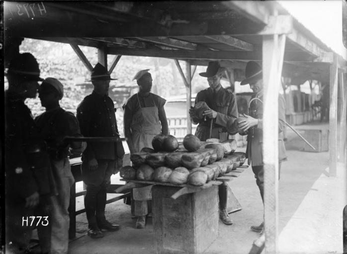 | Keywords: blackandwhite monochrome black and white A fresh batch of loaves are inspected in a bake shed at the first New Zealand Field Bakery in Rouen, France during World War I. Photograph taken on 5 July 1918, by Henry Armytage Sanders. Inscriptions: Inscribed - Photographer's title on negative -bottom left: H773. Quantity: 1 b&w original negative(s). Physical Description: Dry plate glass negative 4.75 x 6.5 inches Examining a batch of bread at the New Zealand Field Bakery, Rouen. Royal New Zealand Returned and Services' Association :New Zealand official negatives, World War 1914-1918. Ref: 1/2-013368-G. Alexander Turnbull Library, Wellington, New Zealand. natlib.govt.nz/records/22431242 A fresh batch of loaves are inspected in a bake shed at the first New Zealand Field Bakery in Rouen, France during World War I. Photograph taken on 5 July 1918, by Henry Armytage Sanders. Inscriptions: Inscribed - Photographer's title on negative -bottom left: H773. Quantity: 1 b&w original negative(s). Physical Description: Dry plate glass negative 4.75 x 6.5 inches Examining a batch of bread at the New Zealand Field Bakery, Rouen. Royal New Zealand Returned and Services' Association :New Zealand official negatives, World War 1914-1918. Ref: 1/2-013368-G. Alexander Turnbull Library, Wellington, New Zealand. natlib.govt.nz/records/22431242 |
