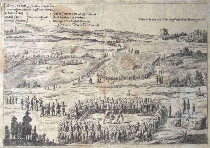 | Keywords: Executions Basel 1653.jpg Execution at Basel of seven of the ringleaders of the Swiss peasant war of 1653 on July 24 1653 Six were decapitated one was hanged Uly Schad in the background right at the gallows on the Gellert Gellert is the name of the hill http //www altbasel ch/dossier/galgen html Immediate image source http //www sondersammlungen zhbluzern ch/b_ms_64_2_execution htm University library of Lucerne Original source Engraving published in Latomus Sigismund Relationis Historicae Semestrialis Continuatio ad annum 1653 Frankfurt am Main 1653 The engraver probably was P Aubry http //www sondersammlungen zhbluzern ch/bk_bilder htm For a colorized version see Image Executions Basel 1653 colored jpg PD-Art Death penalty in Switzerland Executions by hanging Gallows in art 1653 Swiss peasant war of 1653 Artworks missing infobox template |