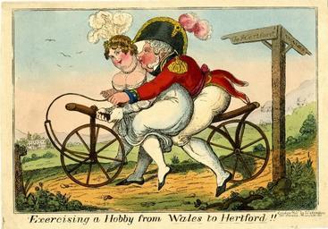Keywords: Exercising a hobby from Wales to Hertford!!.jpg en Exercising a hobby from Wales to Hertford satirical hand-coloured etching by the British printmaker J Lewis Marks Showing the Regent King George IV and Lady Hertford Isabella Anne Ingram Shepherd 2nd Marchioness of Hertford riding one of the new velocipedes 245 mm x 350 mm Courtesy of the British Museum London British Museum http //www britishmuseum org/research/search_the_collection_database/search_object_details aspx objectid 1644213 partid 1 searchText ingram fromADBC ad toADBC ad titleSubject on numpages 10 images on orig 2fresearch 2fsearch_the_collection_database aspx currentPage 5 J Lewis Marks 1819-03-30 PD-old-100 Satire Etchings Marchionesses |