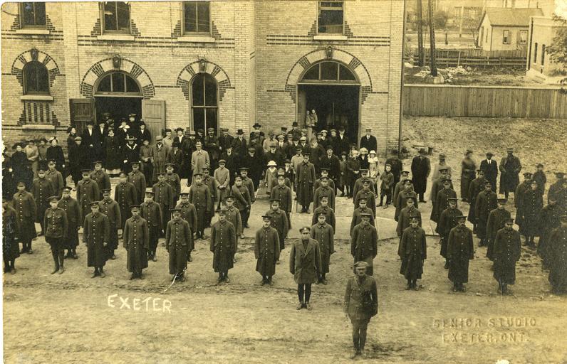 Keywords: outdoor monochrome people Description: Black and white postcard of Exeter's Own, part of the 161st Huron Overseas Battlalion, standing in front of Exeter Town Hall with civilians in the background. The men are all in World War 1 (WW1) uniforms with overcoats. This may have been the final furlough in Exeter. Date: 1916 Object ID : 2007.0062.167 Order a higher-quality version of this item by contacting the Huron County Museum (fee applies). Description: Black and white postcard of Exeter's Own, part of the 161st Huron Overseas Battlalion, standing in front of Exeter Town Hall with civilians in the background. The men are all in World War 1 (WW1) uniforms with overcoats. This may have been the final furlough in Exeter. Date: 1916 Object ID : 2007.0062.167 Order a higher-quality version of this item by contacting the Huron County Museum (fee applies). |