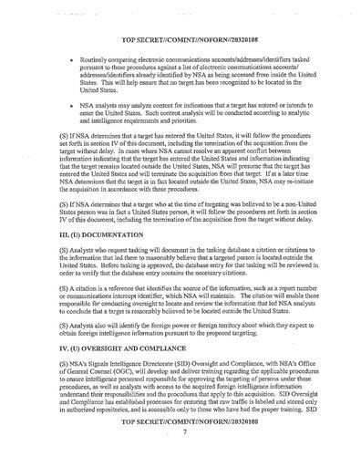 | Keywords: Exhibit-a-p7-normal.jpg EXHIBIT A - PROCEDURES USED BY THE NATIONAL SECURITY AGENCY NON-UNITED STATES PERSONS BELIEVED TO BE LOCATED OUTSIDE THE UNITED STATES TO ACQUIRE FOREIGN INTELLIGENCE INFORMATION PURSUANT TO SECTION 792 OF THE FOREIGN INTELLIGENCE SURVEILLANCE ACT OF 1978 AS AMENDED http //www guardian co uk/world/interactive/2013/jun/20/exhibit-a-procedures-nsa-document 2007-01-08 Eric H Holder Jr PD-EdictGov PD-USGov EXHIBIT A | ||||