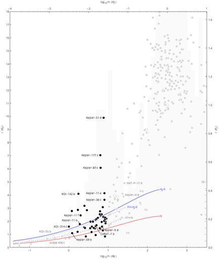 | Keywords: Exoplanet Mass-Radius Scatter Super-Earth.png black transiting Super-Earths black dots 1px solid black compared with those of white Solar System planets gray circles and 1px solid cdcdcd dadada other transiting exoplanets gray dots 1px solid dadada along with fbfbfb the distribution n light gray bar chart of minimum masses see important note below of transiting and non-transiting exoplanets 1px solid white detected through 2014-04-19 Scales indicate log<sub>10</sub> of planetary mass m expressed as Earth masses bottom and Jupiter masses top ; planetary radius r expressed in Earth radii left and Jupiter radii right ; and counts n gray ticks on right References lines are provided for approximate mass-radius relationships<ref name planetmodels > cite journal Seager S M Kuchner C A Hier-Majumder and B Militzer 2007 Mass-radius relationships for solid exoplanets The Astrophysical Journal 669 1279-1297 http //www iop org/EJ/abstract/0004-637X/669/2/1279/ 10 1086/521346 2014-04-18 </ref> for selected planetary compositions H<sub>2</sub>O - hypothetical pure water ice planet; any planet above this line has a significant H/He envelope; 1px solid blue 75 H<sub>2</sub>O + 3 Fe; 22 MgSiO<sub>3</sub> - water world; 1px dotted blue 67 Fe + 32 5 MgSiO<sub>3</sub> - rocky terrestrial; 1px dashed 808080 Fe - hypothetical pure iron planet exoplanets below this line are not likely 1px solid red Exoplanet data is from the Open Exoplanet Catalogue <ref> cite web http //www openexoplanetcatalogue com Open Exoplanet Catalogue 2014-04-19 2014-04-19 </ref> version https //github com/hannorein/open_exoplanet_catalogue/tree/4945b99b43dbd34703a66d74e1b325325c7d3d2a/systems 4945b99 The figure shows all planets up to 10 M<sub>J</sub> omitting 59 more massive planets and transiting planets up to 18 R<sub>E</sub> omitting an additional 17 with m ‰¤ 10 M<sub>J</sub> but r > 18 R<sub>E</sub> PSR B1257+12 b with m < 10<sup>-4</sup> M<sub>J</sub> lies off to the left of the graph and is also omitted Important note This figure is intended to serve as a catalog of generally accepted candidate exoplanets using the distribution of some of their basic properties related to detection No attempt has been made to characterize the degree of confidence which varies widely in the existence of a given planet or its properties Nor is any attempt made to convey systematic errors associated with a particular method In particular the indicated mass m for an exoplanet characterized using radial velocity is the minimum mass so that the actual distribution of masses for non-transiting planets may be shifted and smeared significantly to the right <references/> Own User Aldaron/Credit false true 2014-04-25 Related graphs <gallery> File Exoplanet_Discovery_Methods_Bar png Exoplanet discoveries by year; color-coded by discovery method File Exoplanet Period-Mass Scatter png Scatter plot of exoplanet period and mass data; color-coded by discovery method </gallery> Astronomy plots Astronomy cluster diagrams Astrobiology Language-neutral diagrams Exoplanet diagrams Scatterplots Super-Earths |