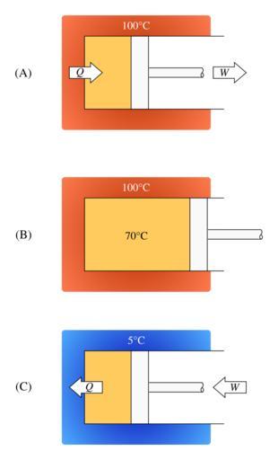 | Keywords: Experiment exploring the second principle of thermodynamics.svg en A conceptual experiment exploring the limitation brought by the second principle of thermodynamics at a macroscopic scale Once a fluid has been heated A and has transformed part of this work as heat B then it must be cooled C if the experiment is to be started again 2014 own Olivier Cleynen other versions cc-zero SVG physics Uploaded with UploadWizard Thermodynamic diagrams | ||||