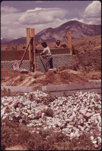 | Keywords: EXPERIMENTAL HOUSE BEING BUILT OF EMPTY ALUMINUM BEER AND SOFT DRINK CANS. IT IS THE FIRST TO USE ALL ALUMINUM CANS... - NARA - 556636.jpg Scope and content General notes 556636 Local identifier 412-DA-14184 Environmental Protection Agency 12/02/1970 - NARA-Author Hiser David 1937- Photographer 3651517 <br /> Taos Taos New Mexico United States North and Central America inhabited place 4203050 36 4 -105 57 <br /> Still Picture Records Section Special Media Archives Services Division NWCS-S National Archives at College Park 8601 Adelphi Road College Park MD 20740-6001 06/1974 Record group Record Group 412 Records of the Environmental Protection Agency 1944 - 2006 Record group ARC 708 DOCUMERICA The Environmental Protection Agency's Program to Photographically Document Subjects of Environmental Concern compiled 1972 - 1977 Series ARC 542493 File unit File unit ARC Variant control numbers Agency-Assigned Identifier 237/24/014184<br /> NAIL Control Number NWDNS-412-DA-14184 Other versions <gallery> File EXPERIMENTAL_HOUSE_BEING_BUILT_OF_EMPTY_ALUMINUM_BEER_AND_SOFT_DRINK_CANS _IT_IS_THE_FIRST_TO_USE_ALL_ALUMINUM_CANS _-_NARA_-_556636 tif tif File EXPERIMENTAL_HOUSE_BEING_BUILT_OF_EMPTY_ALUMINUM_BEER_AND_SOFT_DRINK_CANS _IT_IS_THE_FIRST_TO_USE_ALL_ALUMINUM_CANS _-_NARA_-_556636 jpg jpg </gallery> NARA-cooperation PD-USGov Construction in the United States Michael Reynolds architect Recycling in the United States Taos Experimental House 1974 in New Mexico NARA images of New Mexico |