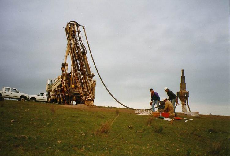 Keywords: Exploration drill.jpg Mobile truck-mounted drill-rig The crushed rock-samples chips are examined and bagged at the Cyclone to the right Photo taken by User Geoz Uruguay 1999 2005-11-06 own assumed Geoz Drilling rigs