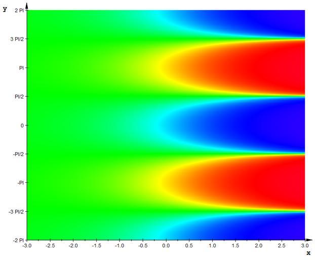 | Keywords: Exponential Function (Real Part) Density.png Diagram of the real part of exponetial function in the complex plane The density is given by <math>z \operatorname Re \left \exp \left x + i y \right \right </math> Blue represents high values red represents low values Please note that the colouring is non-linear it is based on the ArcTan function see the code below and therefore a similar change in hue does NOT necessarily denote a similar change in value Own drawing Plotted in MuPAD 2007-04-20 Inductiveload MuPAD Code <pre> f Re exp x+I y ylimit 2 PI xlimit 3 hsv x y z -> RGB fromHSV 120+85 arctan z 1 1 cplot plot Density f x -xlimit xlimit y -ylimit ylimit Mesh 800 800 AxesTitleFont Courier New Bold 14 TicksLabelFont Arial 10 FillColorFunction hsv YTicksNumber None YTicksAt -3 PI/2 -3 PI/2 -PI -PI -PI/2 -PI/2 -2 PI -2 PI 0 0 PI/2 PI/2 PI PI 3 PI/2 3 PI/2 2 PI 2 PI XTicksDistance 0 5 plot cplot Axes Frame Width 8 5 unit inch Height 7 unit inch </pre> Complex exponential function Hue MuPad diagrams |