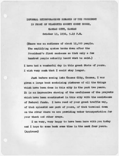 Keywords: Extemporaneous remarks in front of Wyandotte County Court House, Kansas City, KS. - NARA - 197637.jpg Scope and content General notes 197637 Local identifier President 1933-1945 Roosevelt 1933 - 1945 NARA-Author Roosevelt Franklin D Franklin Delano 1882-1945 Author 1301590 <br /> Franklin D Roosevelt Library NLFDR 4079 Albany Post Road Hyde Park NY 12538-1999 1936-10-13 Record group Collection FDR-PPF Papers as President President's Personal File 1933 - 1945 Record group ARC 1185 Speeches of President Franklin D Roosevelt compiled 1933 - 1945 Series ARC 197300 File unit First Carbon Files 1933 - 1945 File unit ARC 197301 Variant control numbers NAIL Control Number NLR-PPF-1820-1STCARBON-SC89 Other versions <gallery> File Extemporaneous_remarks_in_front_of_Wyandotte_County_Court_House _Kansas_City _KS _-_NARA_-_197637 tif tif File Extemporaneous_remarks_in_front_of_Wyandotte_County_Court_House _Kansas_City _KS _-_NARA_-_197637 jpg jpg </gallery> NARA-cooperation PD-USGov Speeches by Franklin Delano Roosevelt Wyandotte County Courthouse Kansas City Kansas Kansas in the 1930s October 1936 1936 in the United States |