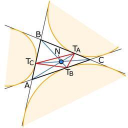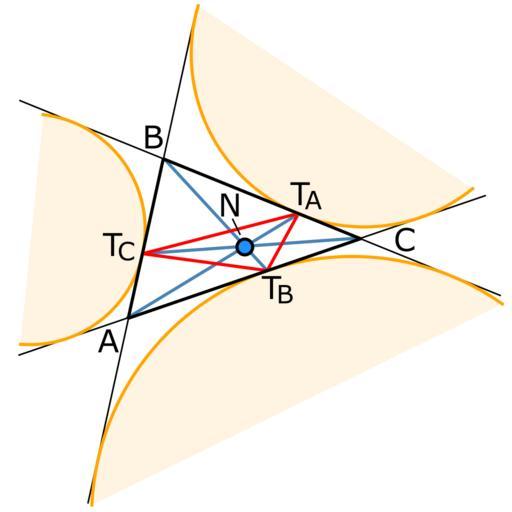 Keywords: Extouch Triangle and Nagel Point.svg Diagram to shown the construction of the extouch triangle red and the Nagel Point blue of a triangle black The orange circles are the excircles of the triangle Self-Made using Inkscape 08/05/2007 Inductiveload Triangle geometry Special points in a triangle |