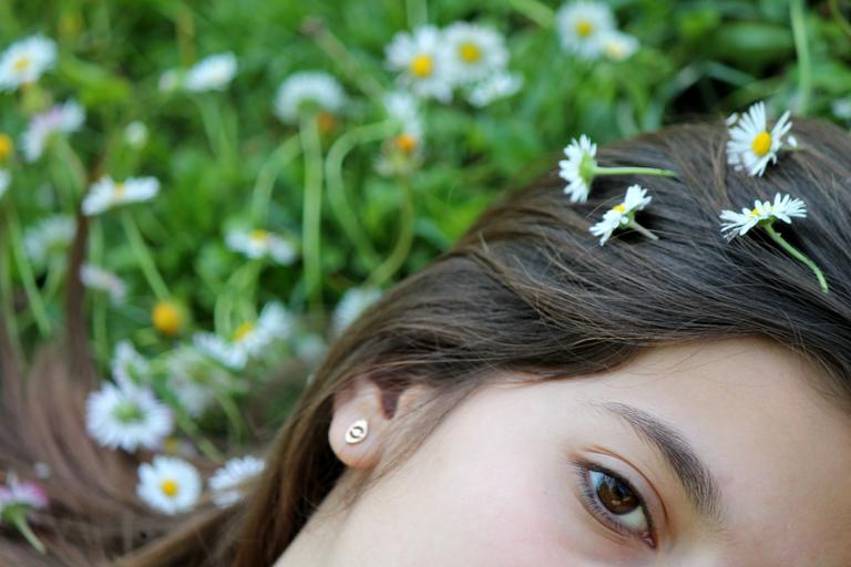 Keywords: eye face hair flowers prato nature daisies park spring woman girl