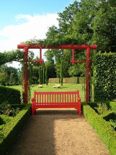 Keywords: eyrignac manor gardens dordogne france summer spring trees plants foliage flowers nature outside sky clouds destinations landmark bench