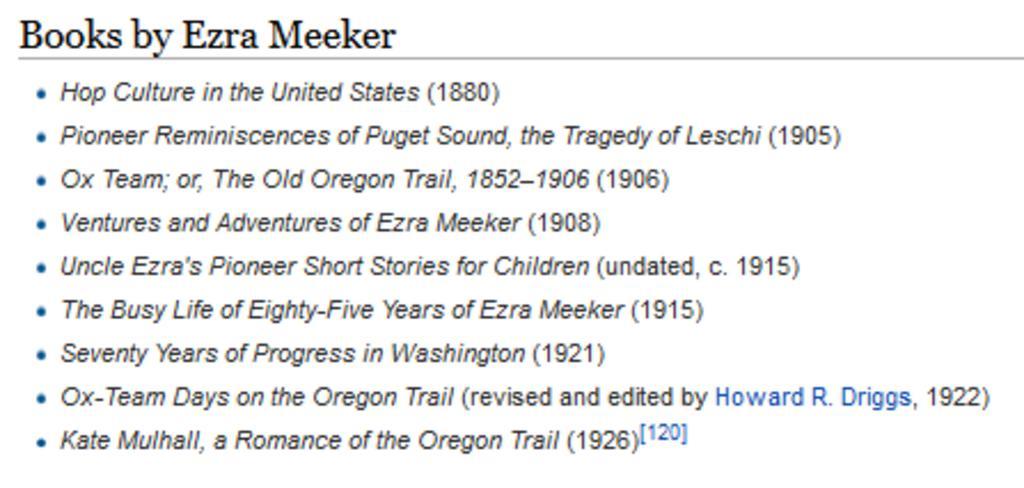 Keywords: Ezra Meeker bibliography before OCLC.png Ezra Meeker before adding OCLC information found at url https //en wikipedia org/w/index php title Ezra_Meeker oldid 561019205 2015-08-27 own Peaceray other versions cc-zero Uploaded with UploadWizard WikiConference USA 2015 proposals |