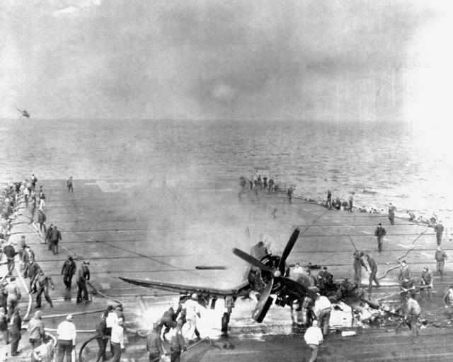 Keywords: F4U-4crash CVA-34 Mar1953.jpeg en Crash of a U S Navy F4U-4 Corsair from fighter squadron VF-124 Carrier Air Group 12 CVG-12 on the aircraft carrier USS Oriskany CVA-34 on 6 March 1953 On that day VF-124 and VA-125 flying Douglas Skyraiders bombed depots trenches and bunkers south of Wonsan and near Hamsong Korea In the middle of these strikes the F4U-4 piloted by Lt Edwin L Kummer VF-124 developed engine trouble shortly after take off Aborting the mission Kummer tried but was unable to jettison all his ordnance as one 113 kg 250 lb bomb hung-up on the bomb rack Unfortunately as the Corsair hit the deck the bomb broke loose bounced up the flight deck and exploded over the No 3 elevator killing two sailors and wounding fourteen others One of the men killed was Photographer Airman Thomas L McGraw killed while filming landing operations while the other was Aviation Electrician Airman Thomas M Yeager The explosion riddled the hangar deck below with shrapnel piercing many of the parked aircraft and flooding the hangar bay with gasoline Firefighting teams quickly extinguished the fire and isolated the hangar deck preventing the fire from spreading into the ship At the same time Airman Richard D Donovan ran through the flames cut the unconscious pilot from his harness and pulled him to safety see photo Damage repair crews put the aircraft carrier back in business within hours and Oriskany began launching airstrikes again on 8 March 1953 http //www defenseimagery mil U S DefenseImagery photo VIRIN http //www dodmedia osd mil/DVIC_View/Still_Details cfm SDAN HNSN9807218 JPGPath /Assets/1986/Navy/HN-SN-98-07218 JPG HN-SN-98-07218 NARA file no 80-G-480705 USN 1953-03-06 PD-USGov F4U Corsairs in the Korean War F4U-4 Corsair Aboard USS Oriskany CV-34 Aircraft accidents aboard aircraft carriers Burning aircraft |