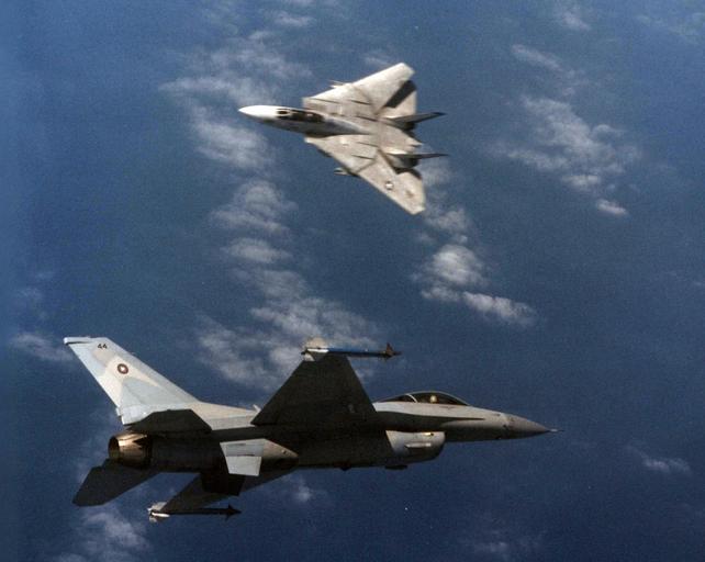 | Keywords: F-14A Tomcat of VF-213 in dogfight with TopGun F-16N in March 1989.jpeg A U S Navy Grumman F-14A Tomcat of Fighter Squadron 213 VF-213 Black Lions flown by CDR Greg Mullet Gerard and LTJG Don Coach Husten engages a General Dynamics F-16N Viper aggressor aircraft flown by Lieutenant Commander George Elwood Dom during training at the Navy Fighter Weapons School TOPGUN at Naval Air Station NAS Miramar California in March 1989 Later in his career Dom served as flight leader of the Blue Angels aerobatics team Official U S Navy photo http //usnhistory navylive dodlive mil/files/2016/05/1996 253 7457 048 jpeg 1996 253 7457 048 from the U S Navy http //www history navy mil Naval History and Heritage Command special webiste http //usnhistory navylive dodlive mil/top-gun-30-years-ago/ Top Gun 30 Years Ago 1989-03 U S Navy PD-USGov-Military-Navy F-14A Tomcat in flight F-16N Viper Dissimilar air combat training United States Navy Fighter Weapons School Fighter Squadron 213 United States Navy |