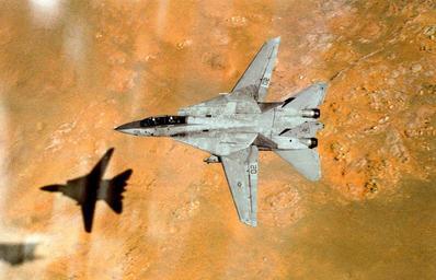 Keywords: F-14A VF-41 over the Saudi desert 1991.JPEG Preceded by its shadow a U S Navy Grumman F-14A Tomcat aircraft from Fighter Squadron VF-41 Black Aces passes over western Saudi Arabia during low-altitude training VF-41 was assigend to Carrier Air Wing 8 CVW-8 aboard the aircraft carrier USS Theodore Roosevelt CVN-71 for a deployment to the Persian Gulf area from 28 December 1990 to 28 June 1991 http //www defenseimagery mil U S DefenseImagery photo VIRIN http //www defenseimagery mil/imagery html guid eaa0b3372892463d4c2201279b4a9c776f460fec DN-SC-92-04260 1991-04-01 Lt Gerald B Parsons USN PD-USGov-Military-Navy F-14A Tomcat in flight Aerial photographs of F-14 Tomcat in flight Fighter Squadron 41 United States Navy Shadows of aircraft |