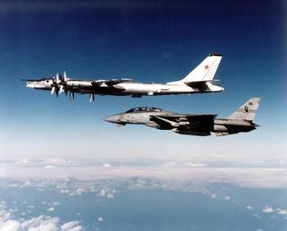 Keywords: F-14A VF-51 Tu95G 1991.jpeg A Russian Tupolev Tu-95 Bear G being intercepted by a U S Navy Grumman F-14A Tomcat from the Fighter Squadron VF-51 Screaming Eagles on 19 April 1991 VF-51 was assigned to Carrier Air Wing 15 CVW-15 aboard the aircraft carrier USS Kitty Hawk CV-63 for a deployment to the Western Pacific and the Indian Ocean from 1 April to 11 December 1991 http //www defenseimagery mil U S DefenseImagery photo VIRIN http //www dodmedia osd mil/DVIC_View/Still_Details cfm SDAN DNSC0410008 JPGPath /Assets/1986/Navy/DN-SC-04-10008 JPG DN-SC-04-10008 1991-04-19 USN PD-USGov Aircraft formation flight of F-14A Tomcat Aerial photographs of F-14 Tomcat in flight Aerial photographs of Tupolev Tu-95 in flight Fighter Squadron 51 United States Navy |
