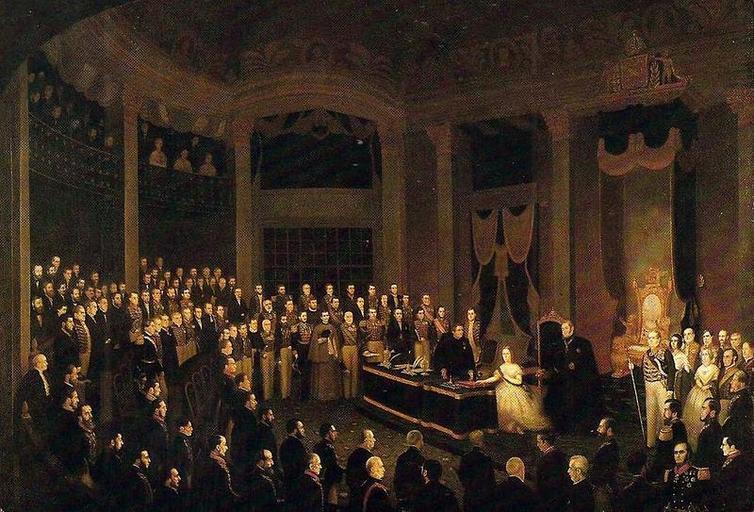| Keywords: F. Tirone - Juramento Constitucional.jpg Juramento Constitucional da Princesa Isabel Princess Isabel's Constitutional Oath - 1861 1862 Oil on canvas cm 166 5 231 5 Museu Histórico Nacional Rio de Janeiro Brazil A obra retrata a Princesa Isabel então com 14 anos prestando juramente à Constituição do Império em 29 de julho de 1860 dia do seu aniversário http //www museuhistoriconacional com br/images/galeria26/mh-g26a027 htm PD-Art Other versions ImageNote 1 392 332 8 8 800 543 2 Duque de Caxias ImageNoteEnd 1 ImageNote 2 533 378 8 8 800 543 2 Princesa Isabel do Brasil ImageNoteEnd 2 ImageNote 3 75 350 8 8 800 543 2 Ministro Euzébio de Queiroz ImageNoteEnd 3 F Tirone History of Brazil 1840-1889 Pedro II Reign Paintings in the Museu Histórico Nacional Isabel Princess Imperial of Brazil Luís Alves de Lima e Silva Brazil in history paintings 1860s paintings from Brazil 1861 |