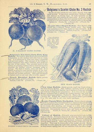 | Keywords: F. W. Bolgiano, seedsmen have won confidence for ten years (16347735146).jpg 935 13 Street N W Washixgtox J C <br> 27 <br> /Bolgiano's Scarlet Globe No 2 Radish <br> Excels all other stocks for rich color shapely form and <br> quick growth It has a rich scarlet color faultless shape <br> and matures in twenty clays It looks beautiful on the <br> market stall and outsells all other sorts It needs no rec- <br> ommendation to those who have already used it and others <br> should try it in their frames or outdoor early in the spring <br> Packet 5c Ounce 10c i Pound 20c i Pound 30c <br> / 1 Pound 60c <br> Vscarlet Olive Sliaped Kadisli This Radish olive <br> shaped has a distinct bright scarlet color The whole <br> crop maturing at one time makes it very desirable It il <br> among the best shippers Packets 5 and 10c i Pound 20c <br> \ Pound 30c 1 Pound GOc <br> Your Strasburg <br> Radish turned out <br> right size right <br> shape and pure <br> white If you want <br> reliable seed get <br> them from J Bol- <br> giano Son <br> A JNeetzke <br> Maryland <br> No 2 SCARLET GLOBE RADISH <br> lolgiano's Xew Extra Early Ruby Kiii <br> Radish We believe Ruby King will soon establish <br> a reputation as the leading sort the best in every <br> way It is handsome in form and color a beautiful <br> oval and rich scarlet The amount of its foliage is <br> small compared with other varieties and small for <br> the size of the radish The peculiar merit of this <br> variety as a forcing radish is that it will bear the heat <br> requisite for forcing without becoming pithy or <br> spongy The flesh is tender juicy and mild It is <br> equally as good for open garden culture as for forc- <br> ing and therefore it commences itself equally to the <br> amateur and market gardener This year our supply <br> is limited and we can only offer it in 25c papers <br> Freiicli Breakfast Radish Quick growth <br> mild and tender good for forcing <br> Packets 5 and lOc i Pound 15c 1 Pound 50c <br> NEW GLASS RADISH <br> New Glass Radish Quick growth small top bright color <br> The best forcing Radish This brilliant uniform radish is not so <br> large as the Long Scarlet Radish but is similar in form and holds its <br> size without losing its nice proportions It is slow to run to seed <br> Market gardeners find it satisfies the market demand and sells bet- <br> ter than other long radishes Packet 5c Ounce 10c i Pound 15c <br> i Pound 25c Pound 40c Plant at once and see what a good radish <br> it isy For sale only in our own sealed packages <br> SCARLET TQRXIP WHIT E TIP RADISH <br> carlet Tvirnip White Tip Radish Nature almost exhaust- <br> id itself in making this beautiful radish to ornament the private table <br> and embellish the market stall It has been brought to our market <br> in two weeks after planting and always is a very early crop for <br> frames and for open ground culture Some gardeners use it in 100- <br> pound lots It is annually grown more and more and in demand <br> everywhere Packet 5c Ounce 10c Pound 15c 4 Pound 25c <br> 1 Pound 40c <br> Culture of Radish For early crop sow in hot beds in Feb- <br> ruary or March For main crop sow 'at intervals from early spring <br> until the last of September in deep rich soil Broadcast sowing ig <br> allowable but drilling is more professional; however radishes do <br> well by either method Thin when they crowd or the crop will be <br> imperfect They may be drawn after a few weeks' growth Radish <br> seed may be sown along the rows with parsnips beets and carrots <br> as they mature rapidly and will not interfere with the other crops 42158385 132780 65933 Page 27 Text http //www biodiversitylibrary org/page/42158385 1899 10 5962/bhl title 65933 F W Bolgiano Co ; Henry G Gilbert Nursery and Seed Trade Catalog Collection Biodiversity Heritage Library F W Bolgiano seedsmen have won confidence for ten years Garden Stories Bulbs Plants Catalogs Fruit Garden tools Nurseries Horticulture Seeds Vegetables U S Department of Agriculture National Agricultural Library bhl page 42158385 dc identifier http //biodiversitylibrary org/page/42158385 bhlGardenStories BHLinbloom bulbs plants nurseries horticulture u s department of agriculture national agricultural library bhlgardenstories bhlinbloom Information field Flickr posted date ISOdate 2015-01-26 Check categories 2015 August 24 CC-BY-2 0 BioDivLibrary https //flickr com/photos/61021753 N02/16347735146 2015-08-24 07 50 53 cc-by-2 0 PD-old-70-1923 F W Bolgiano seedsmen have won confidence for ten years Photos uploaded from Flickr by FĂŚ using a script |