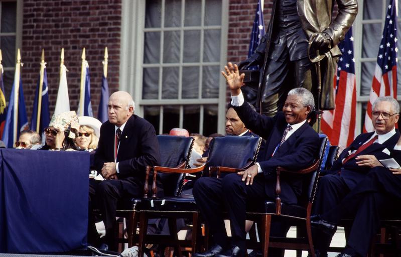 | Keywords: F.W. de Klerk, left, the last president of apartheid-era South Africa, and Nelson Mandela, his successor, wait to speak in Philadelphia, Pennsylvania LCCN2011634246.tif 1 transparency color ; 4 x 5 in or smaller Notes Digital image produced by Carol M Highsmith to represent her original film transparency; some details may differ between the film and the digital images ; Forms part of the Selects Series in the Carol M Highsmith Archive ; Gift and purchase; Carol M Highsmith; 2011; DLC/PP-2011 124 ; Title date subject note and keywords provided by the photographer ; Credit line Photographs in the Carol M Highsmith Archive Library of Congress Prints and Photographs Division ; de Klerk and Mandela were in Philadelphia in 1993 to receive America's Liberty Medal for effecting the transition to black majority rule 1993 Creator Carol M Highsmith Library of Congress Catalog http //lccn loc gov/2011634246 Image download https //cdn loc gov/master/pnp/highsm/16000/16053a tif Original url http //hdl loc gov/loc pnp/highsm 16053 No known restrictions on publication LOC-image highsm 16053 PD-Highsmith Images uploaded by Fæ Photographs by Carol M Highsmith |