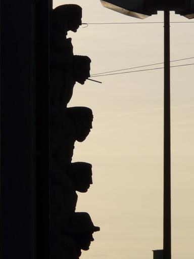 Keywords: facade building shadow play head heads shadow back light person face portrait profile