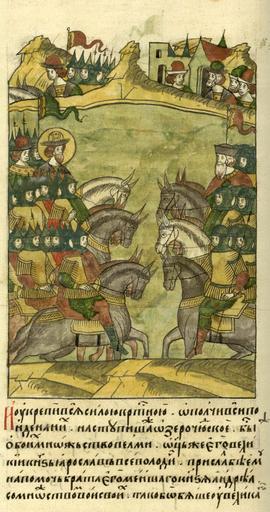 Keywords: Facial Chronicle - b.06, p.084 - Battle of the Ice.jpg Schlacht auf dem Peipussee unmittelbar vor der Schlacht en Alexander Nevskiy ice battle ru Ледовое побоище И ук епил Александ всех силой к естной и подняв всех за собой пошел на немцев Пот яслось же озе о Чудское было же обоих войск множество большое Отец же Александ а великий князь Я ослав Всеволодович п ислал ему на помощь б ата Александ ова меньшего князя Анд ея с множеством воинов своих; так что было у великого князя Александ а множество х аб ых воинов как некогда у ца я Давида были воины сильные и к епкие И воины великого князя Александ а исполнились духом воинским; были же се дца их как у львов И сказали воины «О князь наш почтенный и до огой тепе ь п ишло в емя нам положить головы свои за тебя» Великий же князь Александ поднял уки свои к ебу и сказал «Суди Боже и ассуди спо мой; от на ода го деливого помоги Господи как некогда оисею помог одолеть Амали ка и п едку моему князю Я ославу окаян ного Святополка» http //www akteon-elib ru/LITsIeVOI-LIeTOPISNYI-SVOD-Russkaya-letopisnaya-istoriya-Kniga-6/ 20 unbekannt unknown неизвестен 16 Jh 16th centry 16 века PD-Art Alexander Nevsky in miniature Facial Chronicle v 5 - Laptevskiy tom 1116-1252 Files uploaded by Shakko from various sources Battle of the Ice