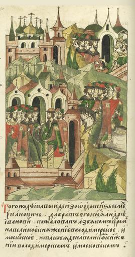 | Keywords: Facial Chronicle - b.07, p.450 - Simeon Gordy enthroned.jpg  ЛИЦЕВОЙ ЛЕТОПИС ЫЙ СВОД В том же году вышел из О ды князь Семен Иванович да б ат его князь Анд ей Иванович пожалованный ца ем на великое княжение Владими ское и  осковское И стал он великим князем Владими ским и  осковским http //www akteon-elib ru/LITsIeVOI-LIeTOPISNYI-SVOD-Russkaya-letopisnaya-istoriya-Kniga-7/ 2 century 16 anonymous PD-Old Facial Chronicle v 6 - Ostermanovskiy 1-y tom 1254-1378 Files uploaded by Shakko from various sources 1340 in Russia Andrey Ivanovich of Serpukhov Simeon of Moscow in miniature Oz Beg Khan |