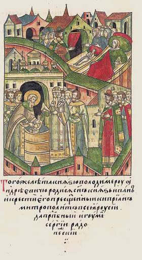 | Keywords: Facial Chronicle - b.10, p.006 - Birth of Ivan Vladimirovich of Serpukhov.jpg Лицевой летописный свод В том же году у князя Владими а Анд еевича одился сын князь Иван и к естил его п еосвященный Кип иан мит ополит всея Руси да п еподобный игумен Се гий Радонежский sterligoff ru/books/Rus_Kniga 10 pdf century 16 anonymous PD-Old Facial Chronicle v 7 - Ostermanovskiy 2-y tom 1378-1424 Files uploaded by Shakko from various sources Ivan Vladimirovich of Serpukhov 1381 in Russia Sergius of Radonezh in manuscripts Cyprian Metropolitan of Moscow |