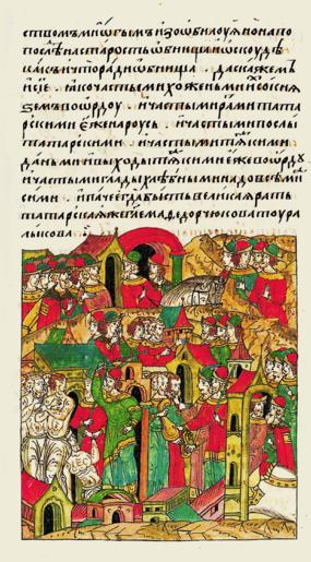 | Keywords: Facial Chronicle - b.11, p.007 - Sergius of Radonezh.gif но потом в ста о- сти обнищал и од их оскудел Расска- жу и о том почему обнищал из-за частых хождений с князем в О ду из-за частых набегов тата ских кото ые испытывала Русь из-за частых п иходов тата ских послов из-за частых тяжких даней и по- бо ов о дынских из-за частых голодных хлебных лет о самой тяжкой бедой был набег великой ати тата ской называе- мой Федо чукова ать Ту алыкова И после него еще год п одолжа- лось насилие потому что великое княжение осковское досталось великому князю Ивану Дани- ловичу и княжение Ростовское также отошло к оскве Увы увы тогда го о- ду Ростову особенно князьям остовским когда отнята была у них власть а вели- кое княжение иму- щество честь и слава и все п очее отошло к оскве По повеле- нию великого князя Ивана Даниловича был послан из о- сквы в Ростов воево- дой один из вельмож по имени Василий п озвищем Кочева и с ним ина И когда вошли в го од Ростов то п инесли ог ом- ное бедствие го оду и всем живущим в нем Умножились гонения и немало п ишлось им отдать москвичам имущества своего а сами уда- ы по телам своим с уко ом получали и с пустыми уками отходили И многие оказались в бедствен- ном положении пото- му что не только всего имущества лишились но и получили аны на теле и беду эту жа- лостно носили в себе и те пели http //www runivers ru/bookreader/book480190/ page/7/mode/1up century 16 anonymous PD-Old Files uploaded by Shakko from various sources Facial Chronicle v 7 - Ostermanovskiy 2-y tom 1378-1424 Sergius of Radonezh in manuscripts |